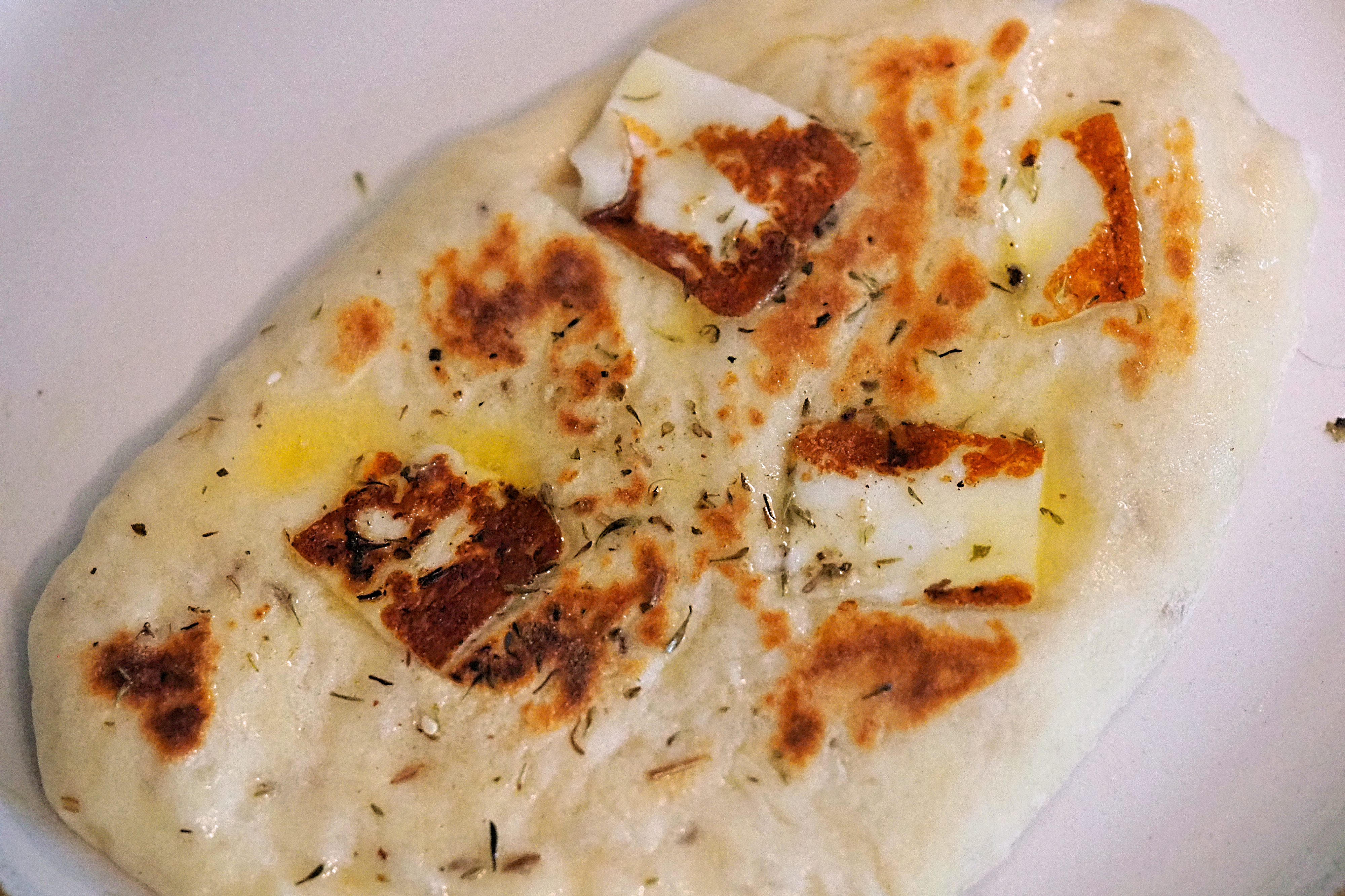 - Quickly press some pieces of halloumi into the upside of the flatbread to embed them (I use around 3 pieces for smaller flatbreads and 4 for larger ones)