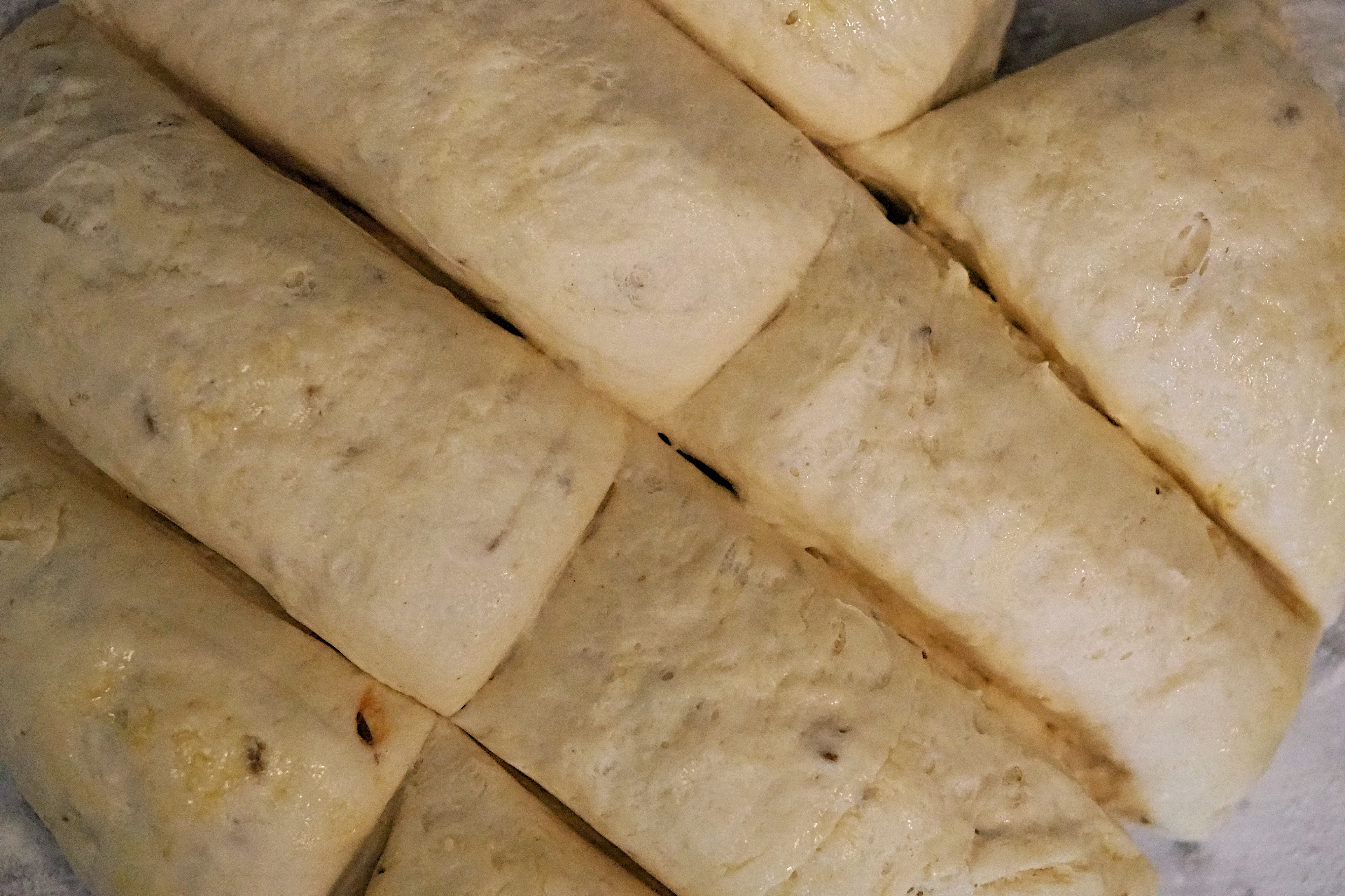 - Once the dough has rested, pour it onto a floured surface – using a dough cutter or a long, flat knife: cut it into 8 pieces (don’t worry about them being the exact same size – a bit of variation is nice!)