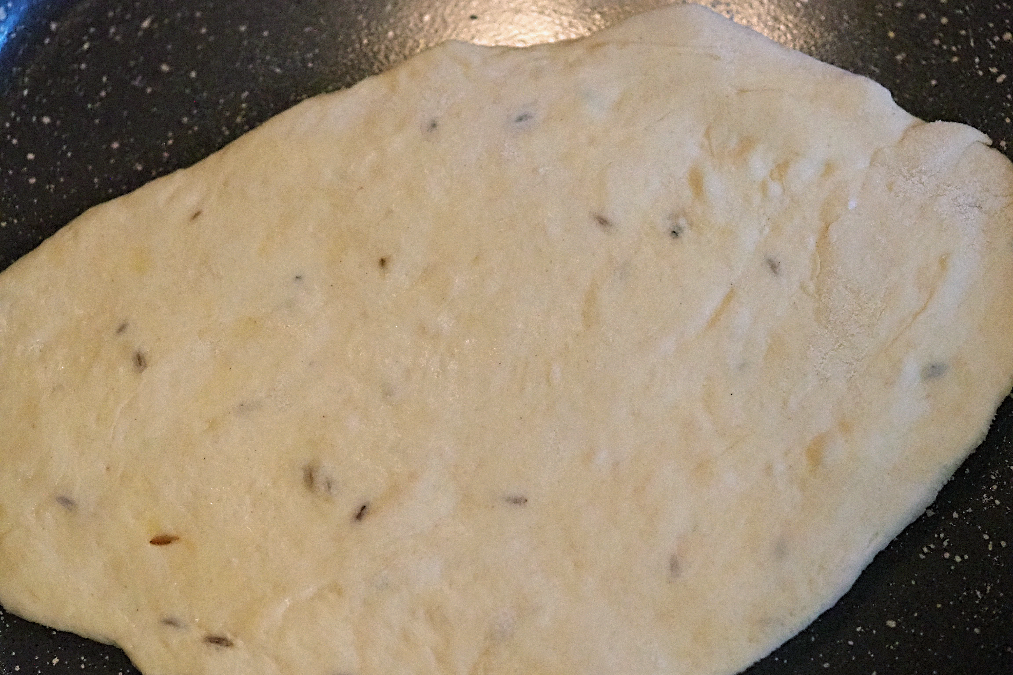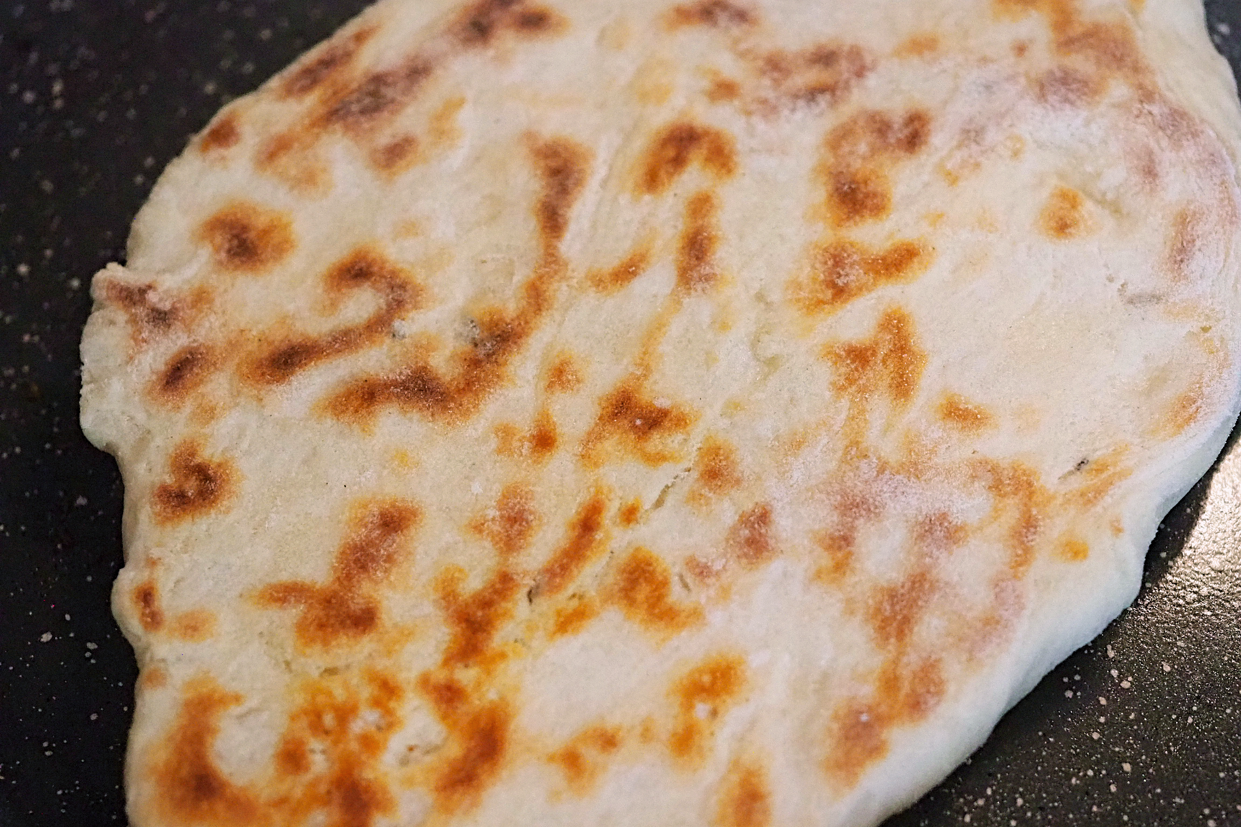 - The underside will need c.3 minutes to cook and you will notice your flatbread rise a little – once this is done, use a spatula to cleanly flip the flatbread and cook for 3 minutes on the upside