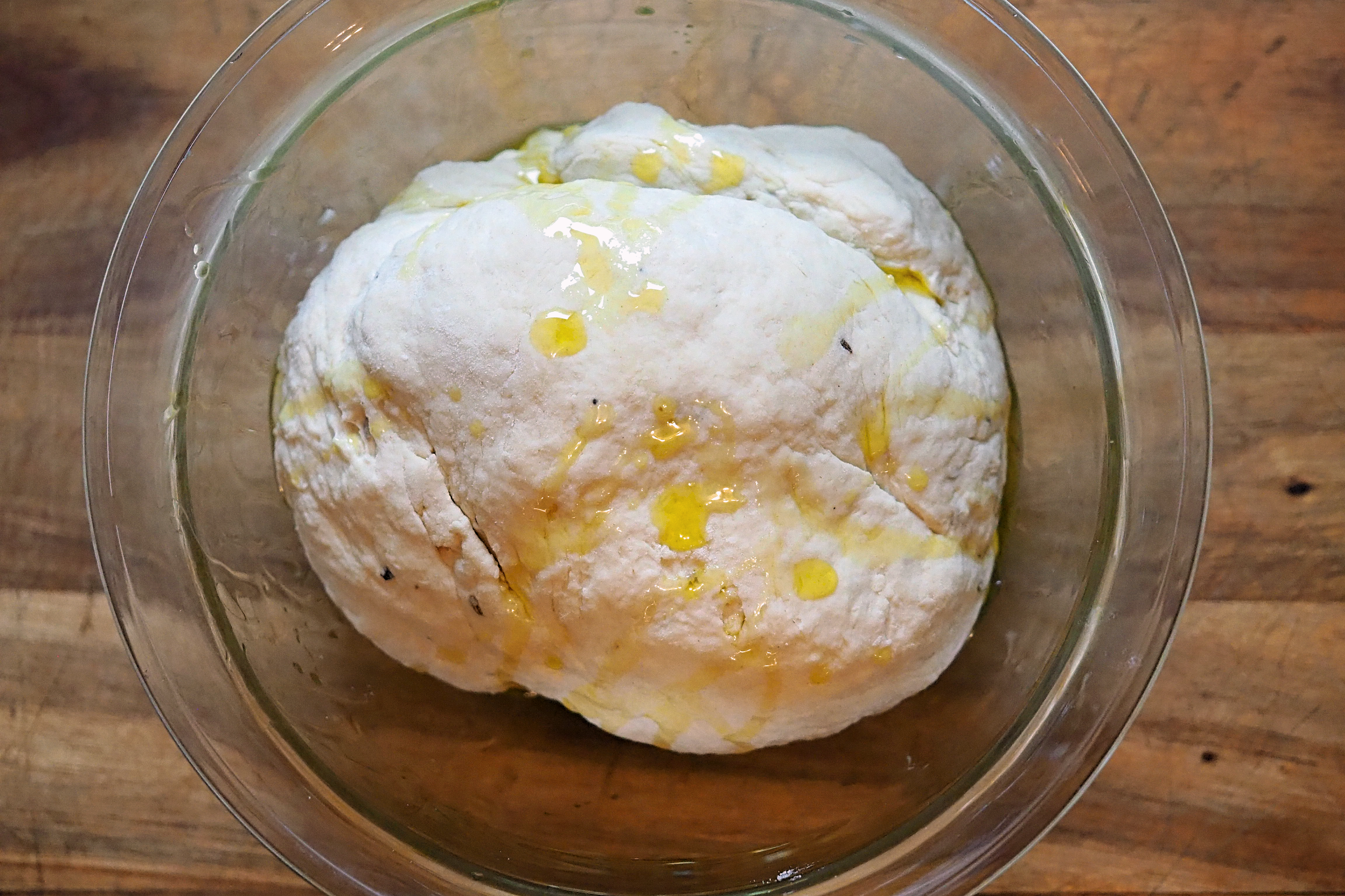 - Put the dough in an oiled bowl, add a little more oil over the top and cover it with a tea towel for an hour