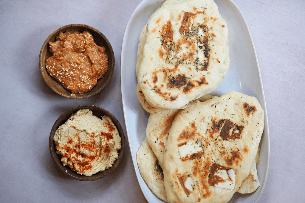 I like to serve these flatbreads alongside tasty dips like my go-to halloumi and my roasted red pepper harissa dip. Let me know if you try this one!