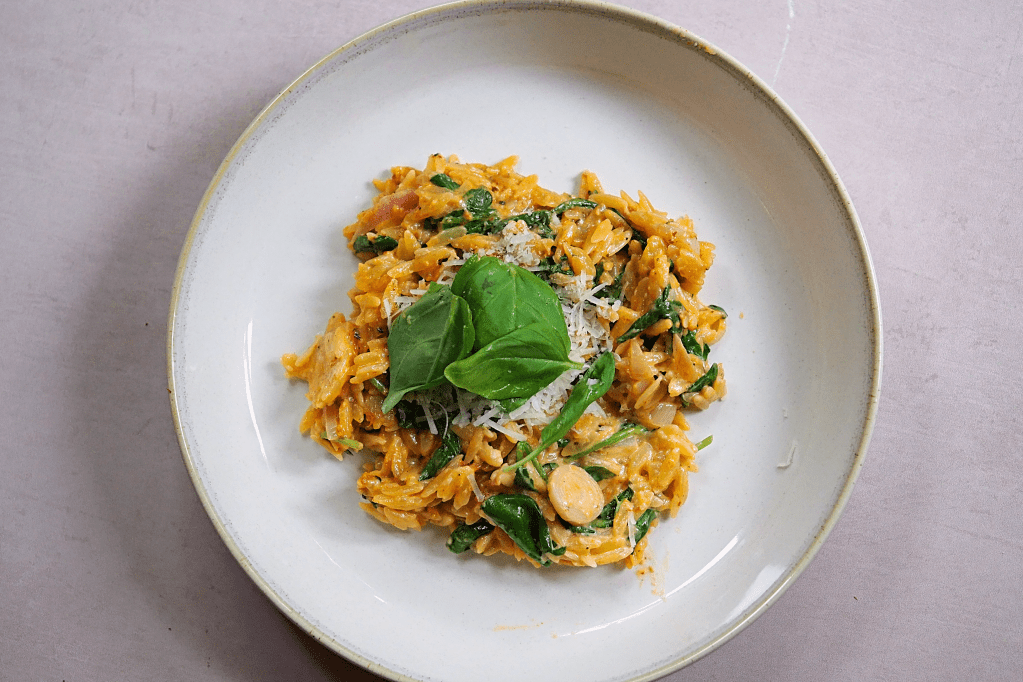 To make this orzo, I fried a shallot and 2 cloves of garlic in butter over a medium heat, seasoned with a little salt and pepper, added some lemon juice, followed by my orzo. I gradually mixed in water until the orzo absorbed it all and was cooked through. I then toasted and crushed some pink peppercorns and added them, along with a little grated Italian hard cheese. I added my pesto, along with some double cream and chopped spinach. It was then served with more of the cheese and some fresh basil as a topping.