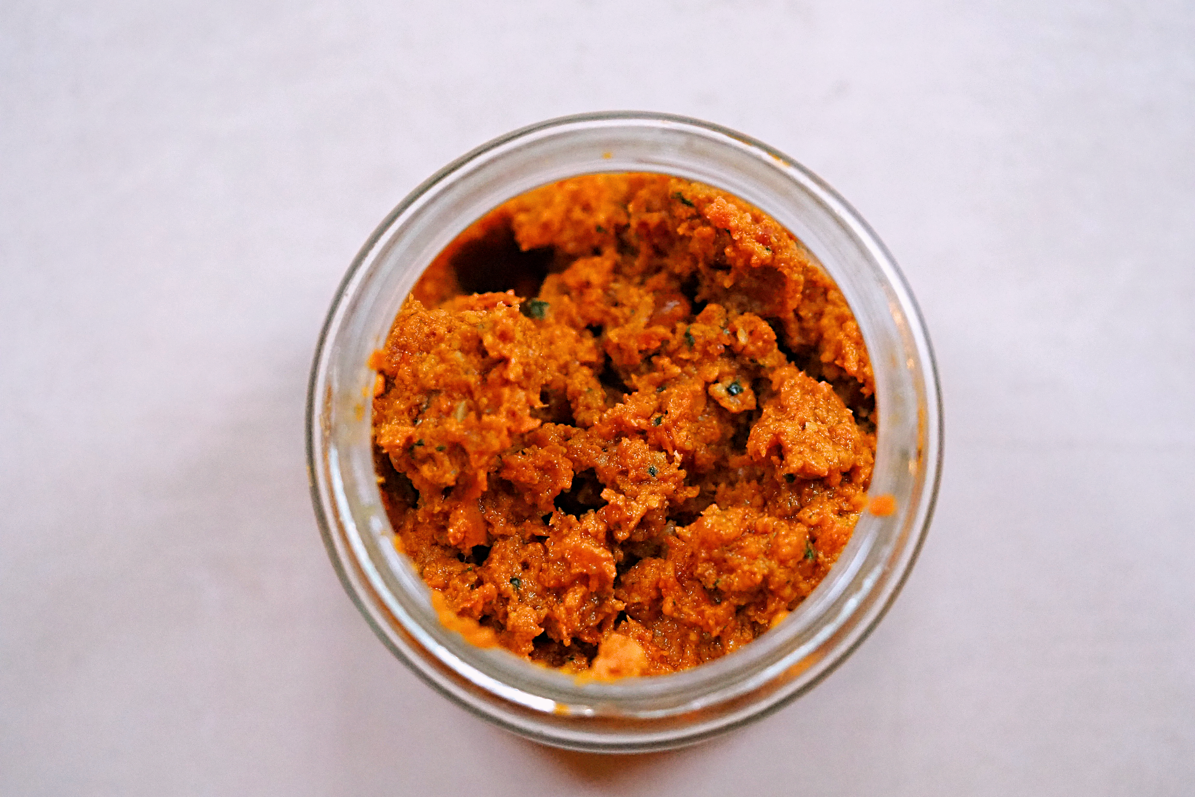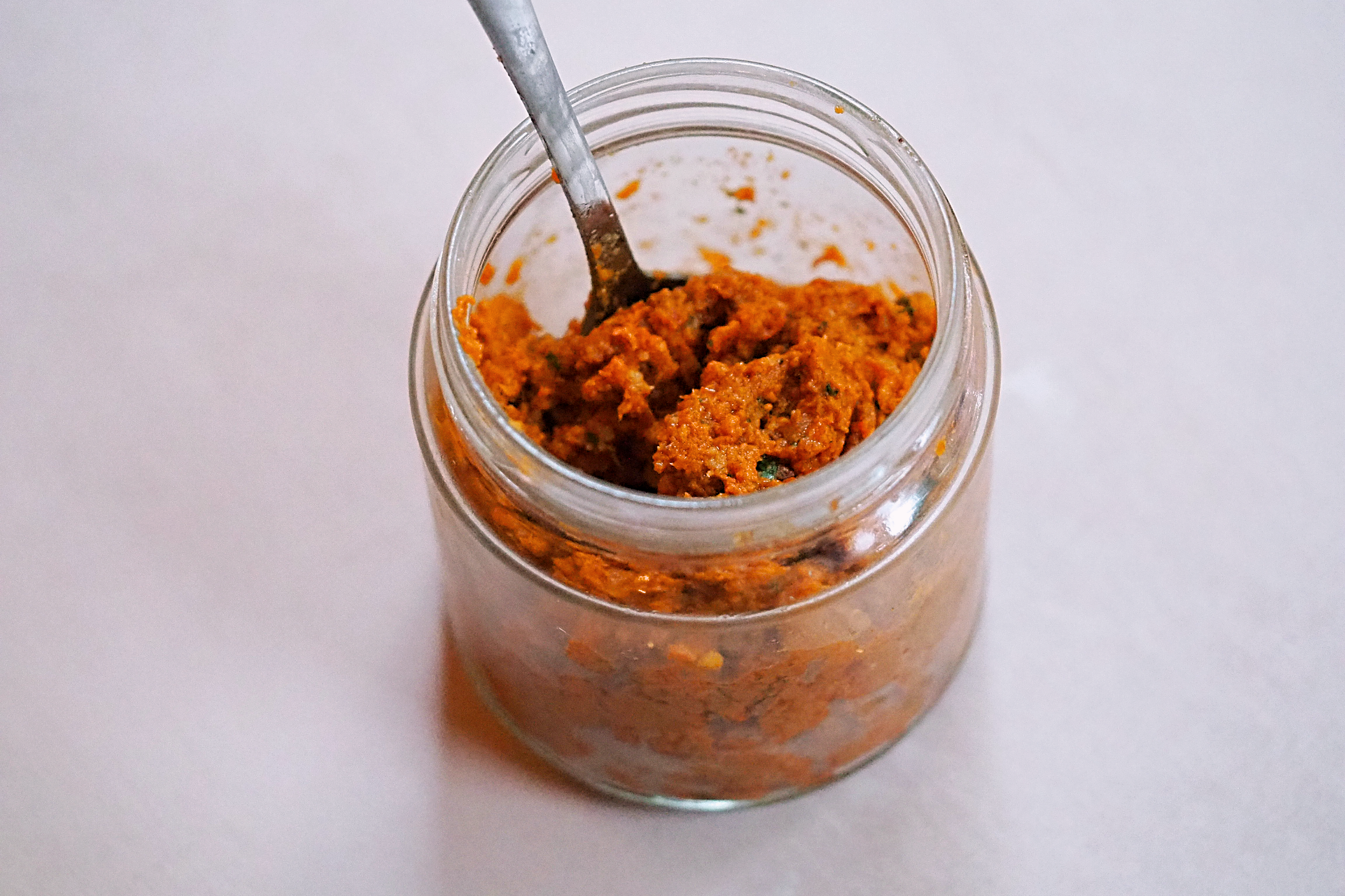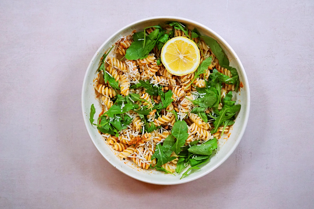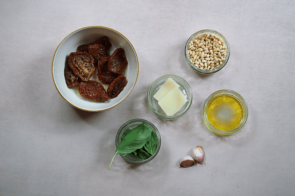 Today I’m sharing a recipe that’s almost always sat in my fridge these days, for when I want something fresh and tasty but don’t have a lot of time. Pesto is made up 5 components: a herb or vegetable of some kind, nuts, olive oil, garlic and cheese, traditionally mashed together in a mortar and pestle. The classic combination is basil, pine nuts, olive oil, garlic and parmesan, but you can really get creative within these categories. Today we’re doing a prep-friendly sun-dried tomato recipe with maximum flavour.