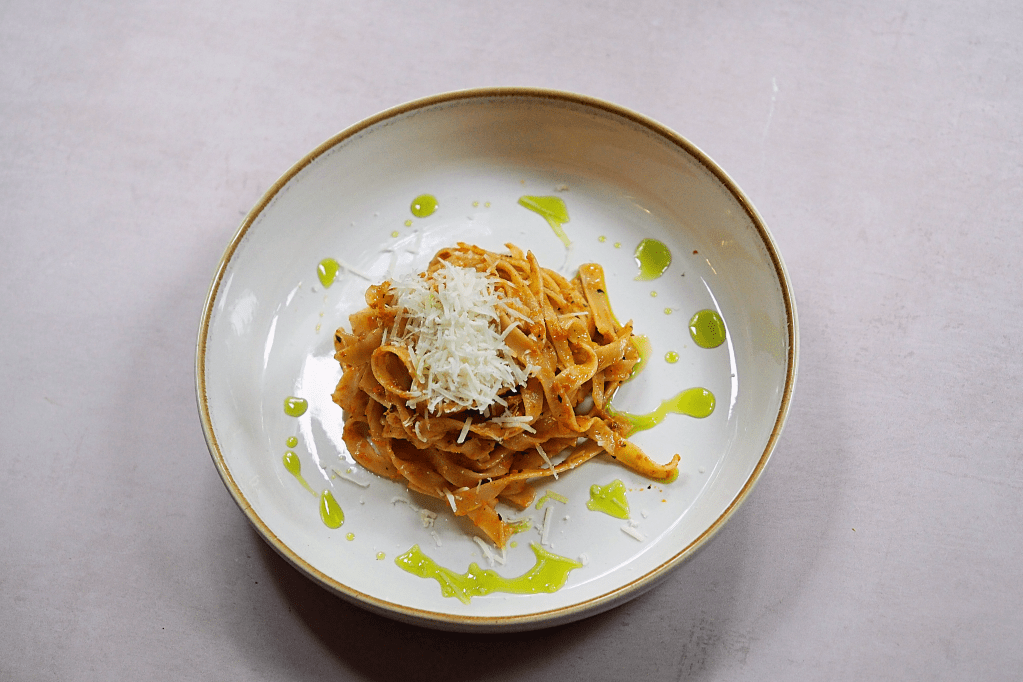 To make this tagliatelle, I cooked my pasta in salted water until it was al dente. I then saved a little pasta water and drained the rest. In a non-stick pan, I added my pesto and the pasta water along with some black pepper to make it a little more saucy. I then stirred in my tagliatelle until it was completely coated in sauce. I served this with a little Italian hard cheese as a topping and with a drizzle of basil-infused olive oil. Let me know if you want more detail on this but it’s pretty simple; I blended together two parts olive oil to one part basil and then simmered it over a low heat for 15-20 minutes then used a sieve to separate out the remaining basil from my infused oil.
