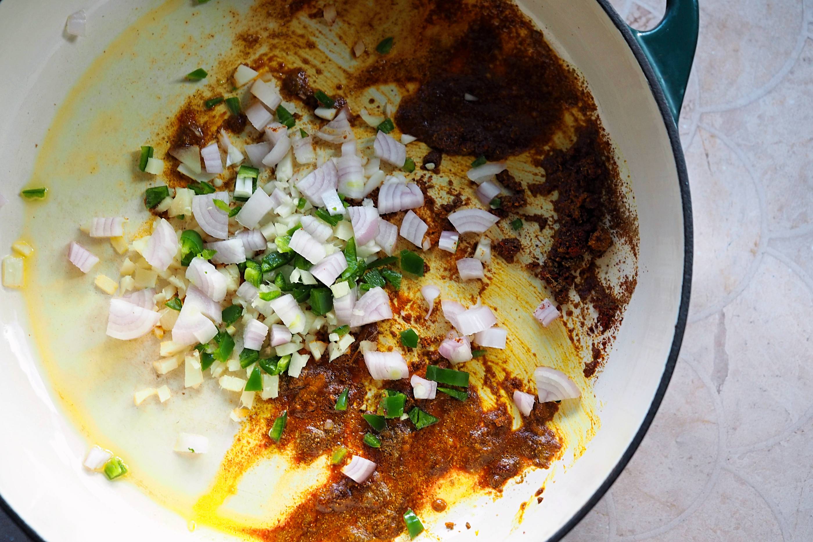 - Melt half the butter / ghee over a medium heat in a large, wide-based lidded pan over a medium-high heat and add the turmeric, cumin, garam masala and chilli powder – allow to bloom for 30-60 seconds before adding the garlic, shallot and ginger with salt and pepper – cook until fragrant (around 5 minutes)