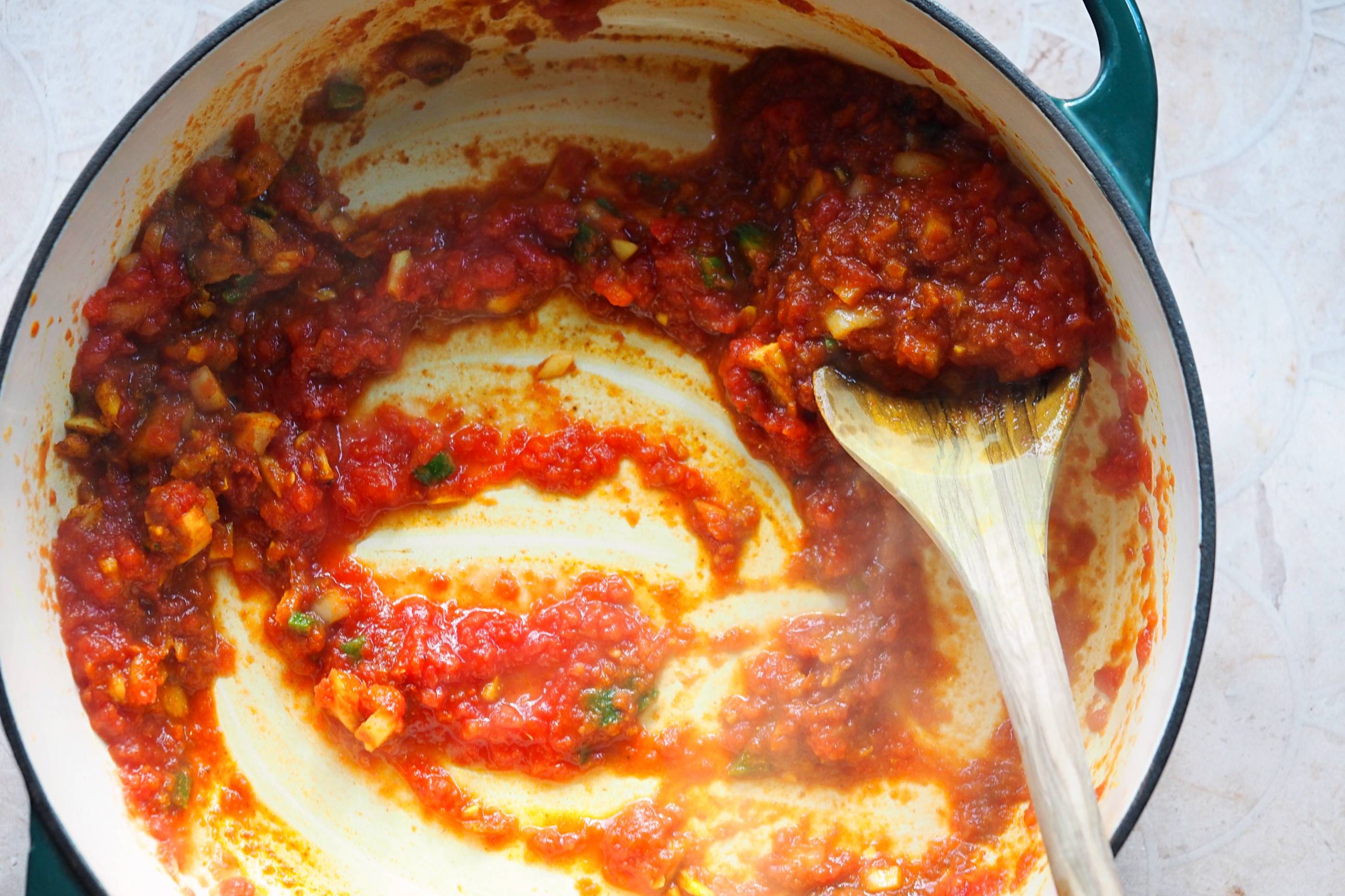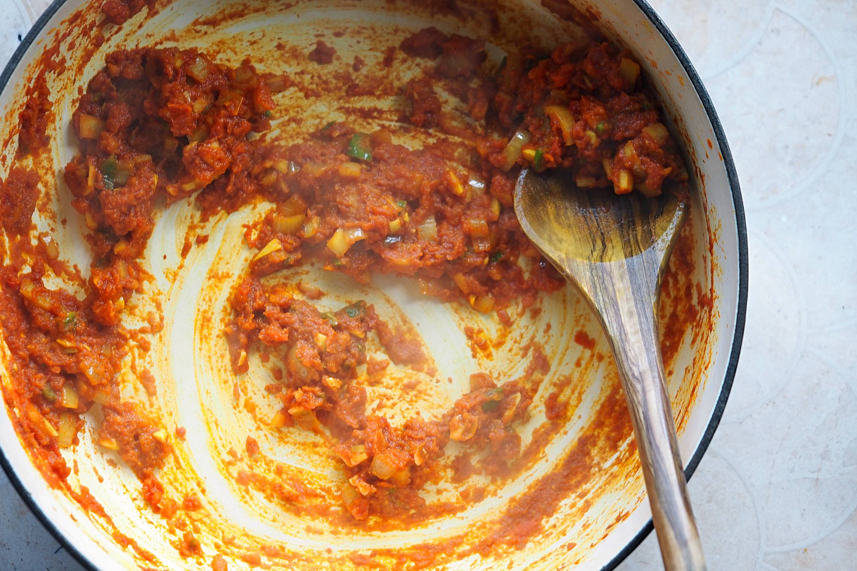 - Add the paste back into your pot on a low heat and add some extra water, if needed – taste for seasoning and add the dash of sugar, if required