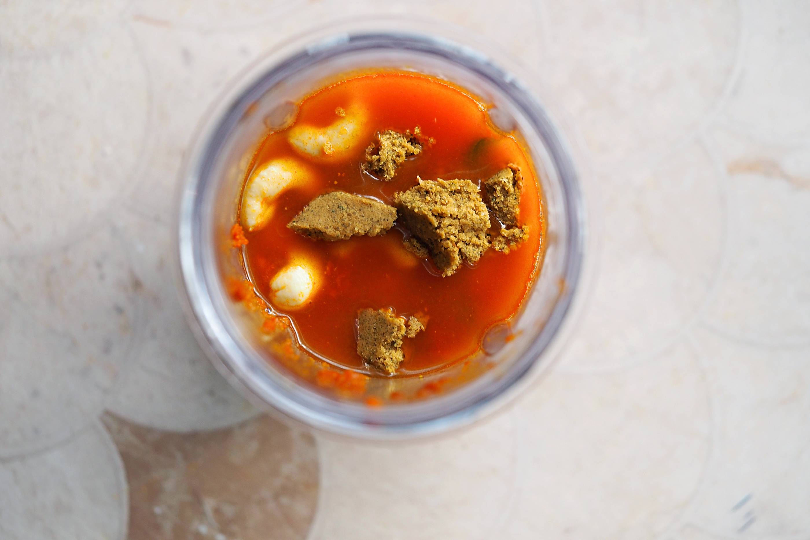 - Add the curry base to a blender with the soaked cashews and soaking liquid and optional vegetable stock cube and blend until smooth