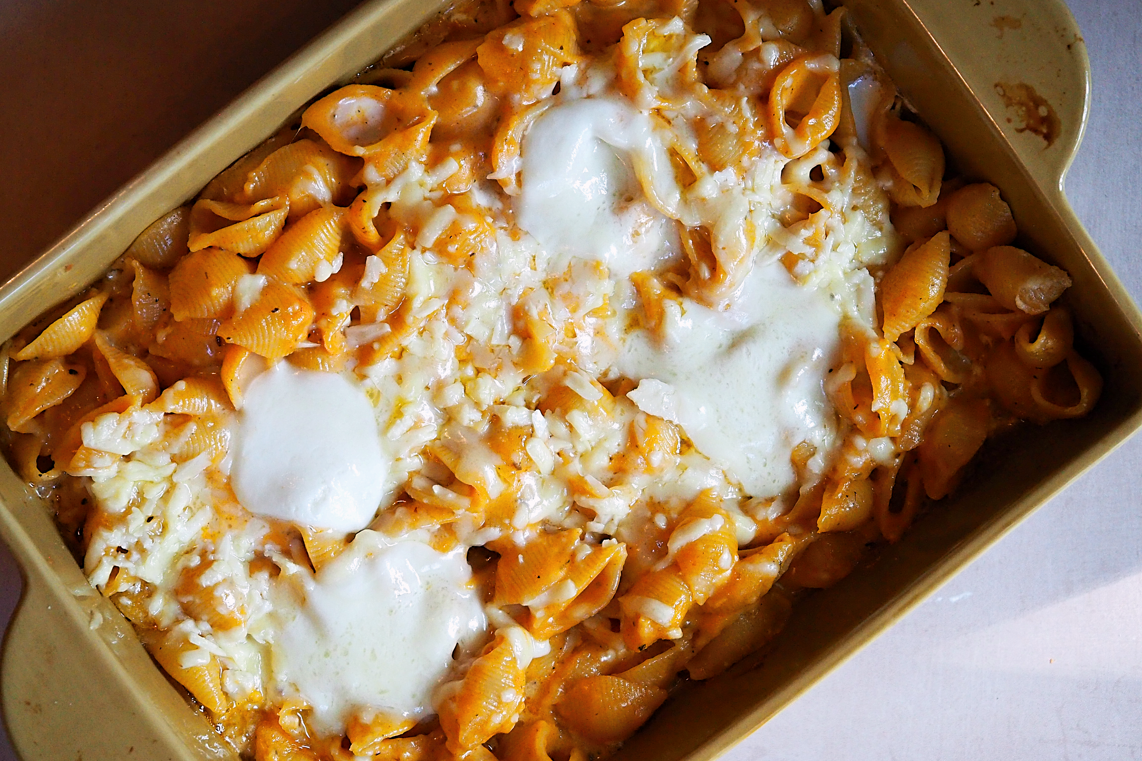 Make sure you cook the pasta to just less than al dente (so, if the pack says 10 minutes cook time, I’d go for 7) because it will continue cooking in the sauce when it’s in the oven. Also, make sure you do your initial bake with the dish covered in tin foil to prevent it drying out. You can then remove it for the final 10 minutes under the grill to get a crispy golden finish.