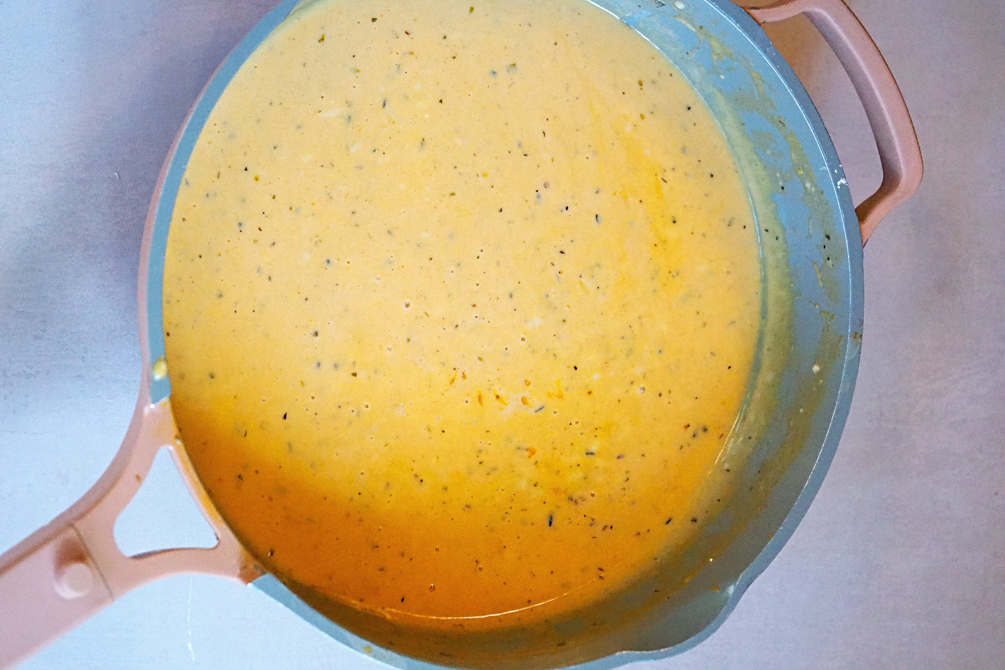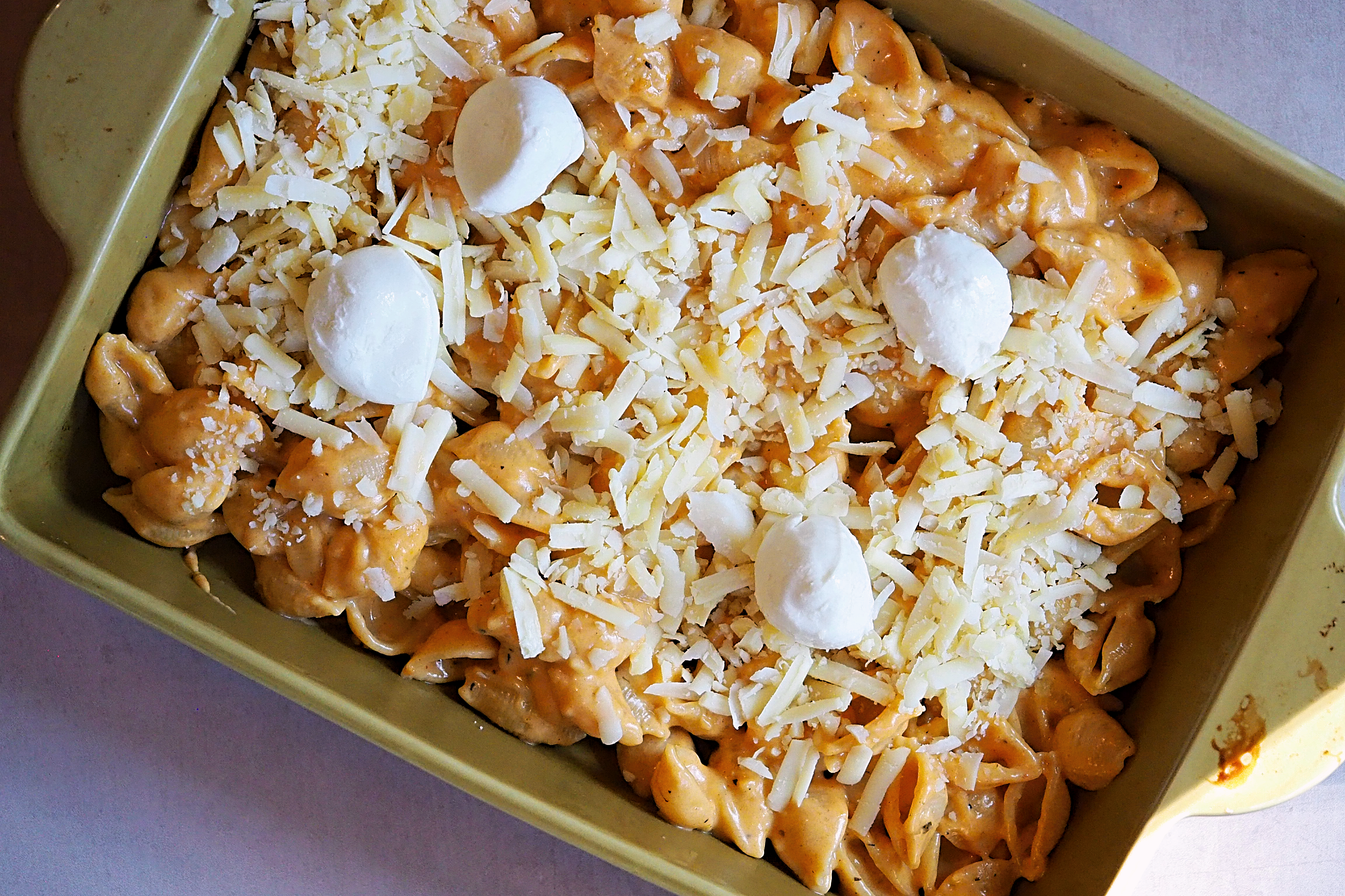 - Once the sauce is slightly runnier than your desired consistency, turn off the heat and begin adding in the cheese gradually, whisking it in and allowing it to melt (reserve around 1/4 to 1/3 for the topping)