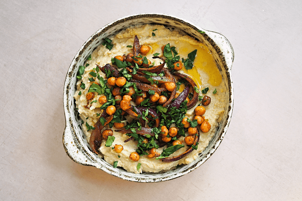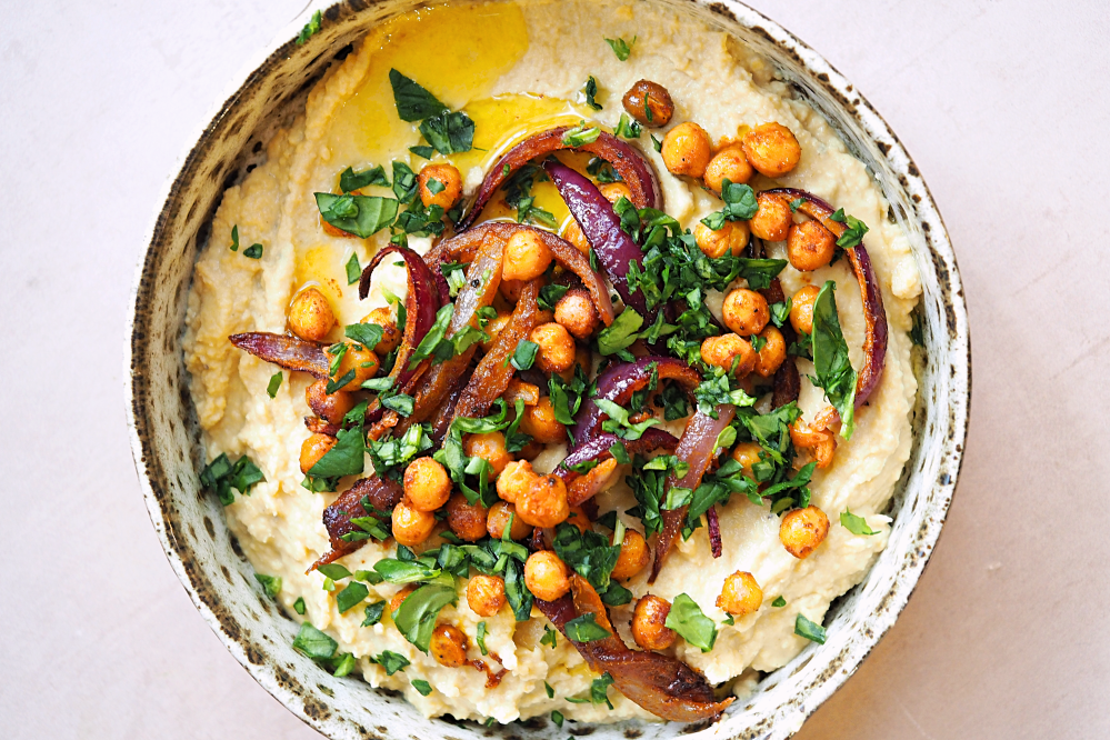 - Serve topped with a drizzle of olive oil, the smoked paprika chickpeas and red onion and the chopped fresh herbs