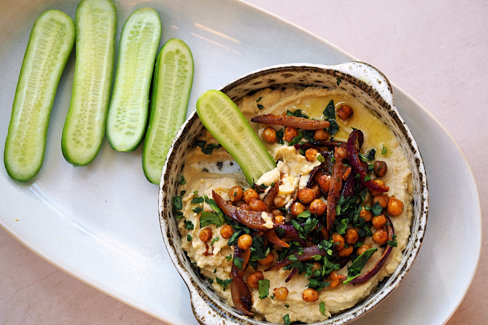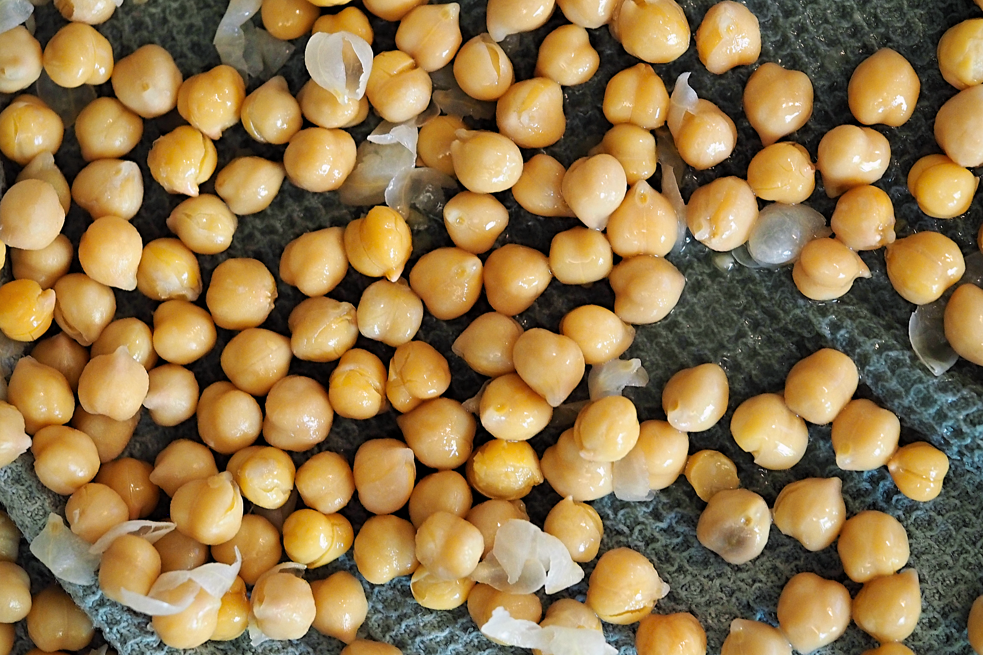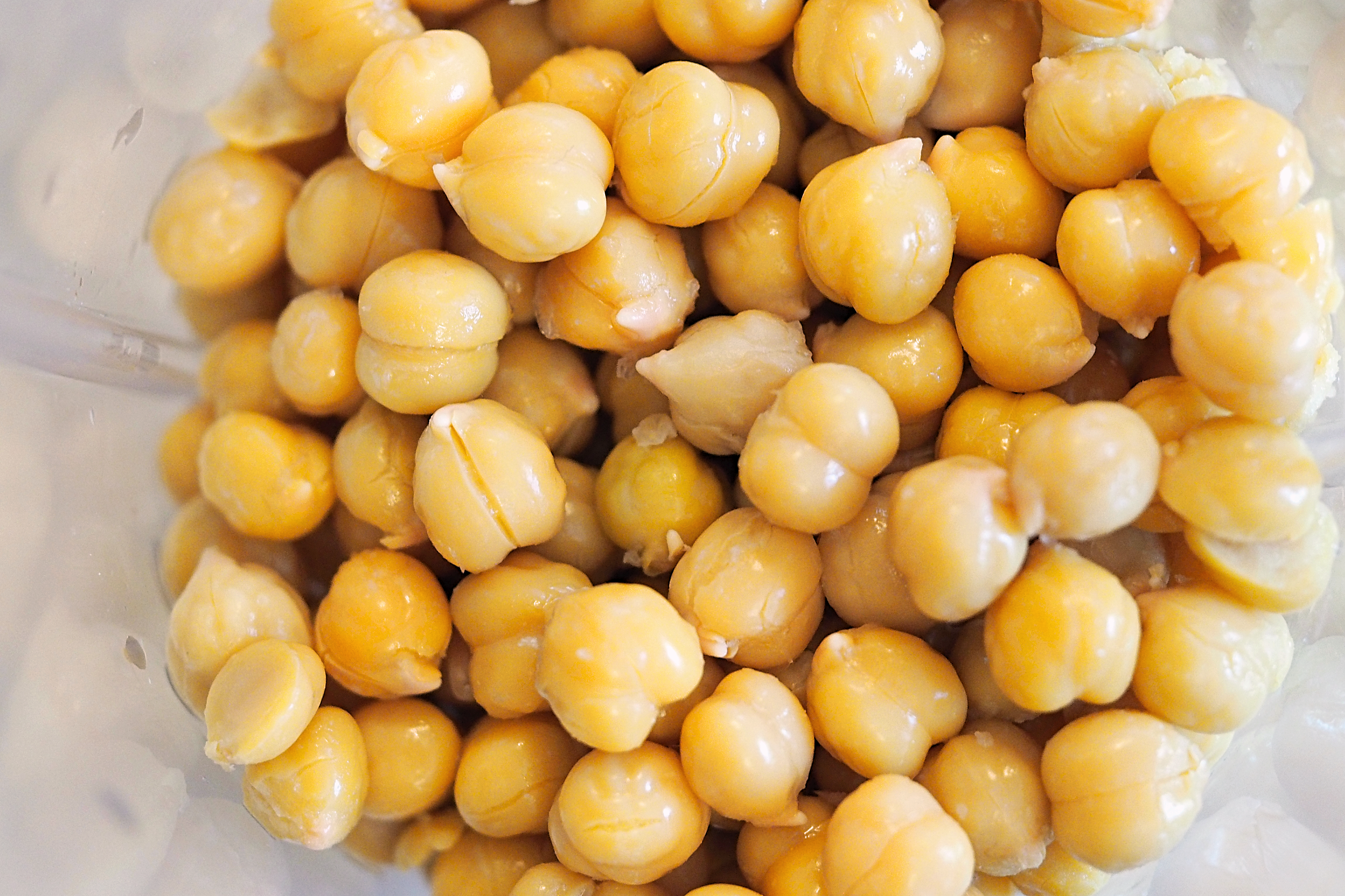 - Add the garlic, skinned chickpeas, lemon juice, tahini and cumin to a food processor – season to taste and pulse to a cream consistency