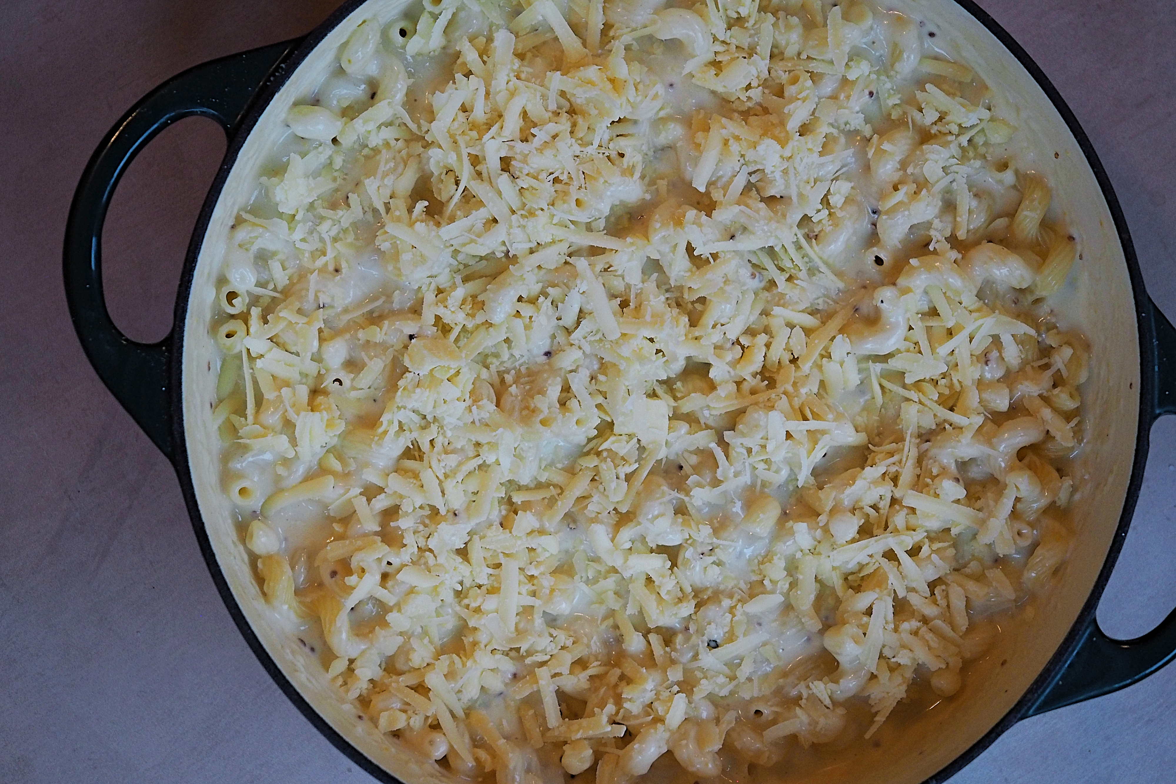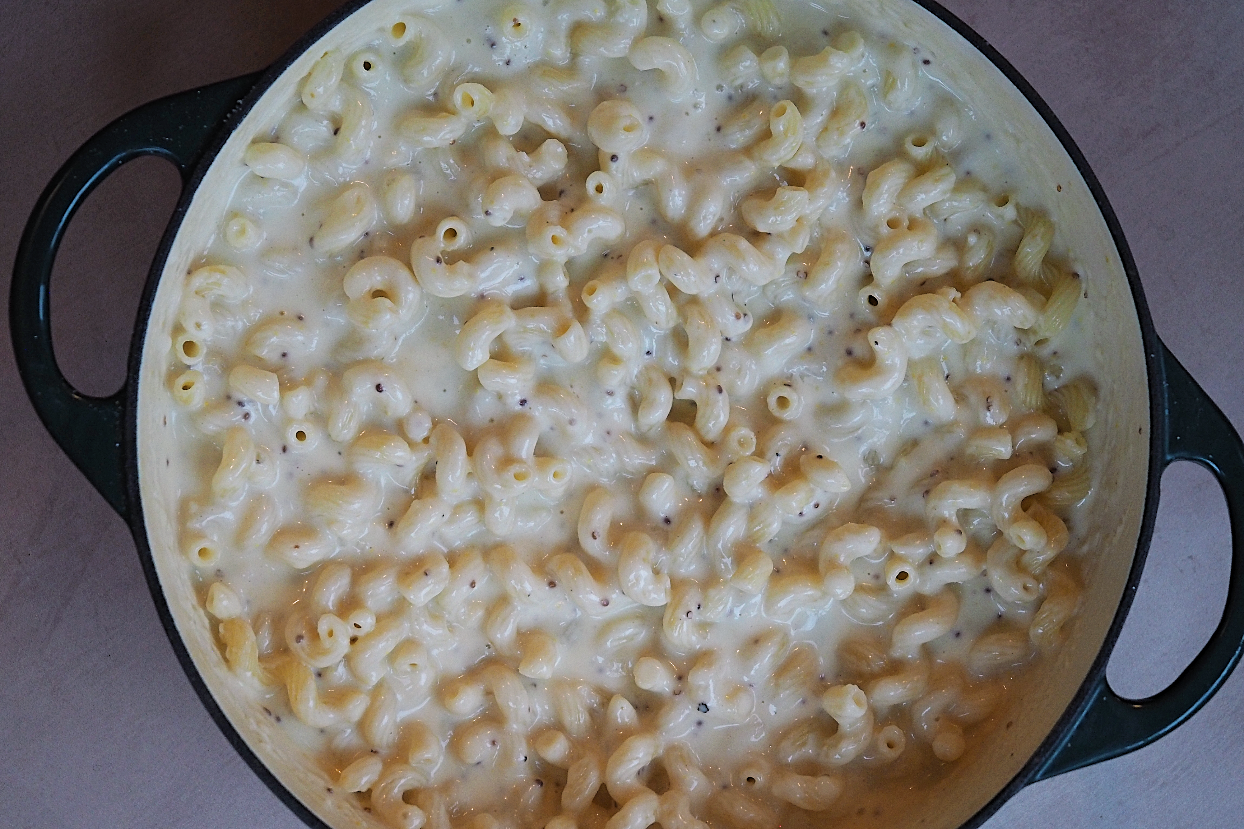 - Once the sauce is slightly runnier than your desired consistency, add the mustard, turn off the heat and begin adding in the cheese gradually, whisking it in and allowing it to melt (reserve around 1/4 to 1/3 for the top) – if your sauce looks chunky, add in that pasta water you saved earlier