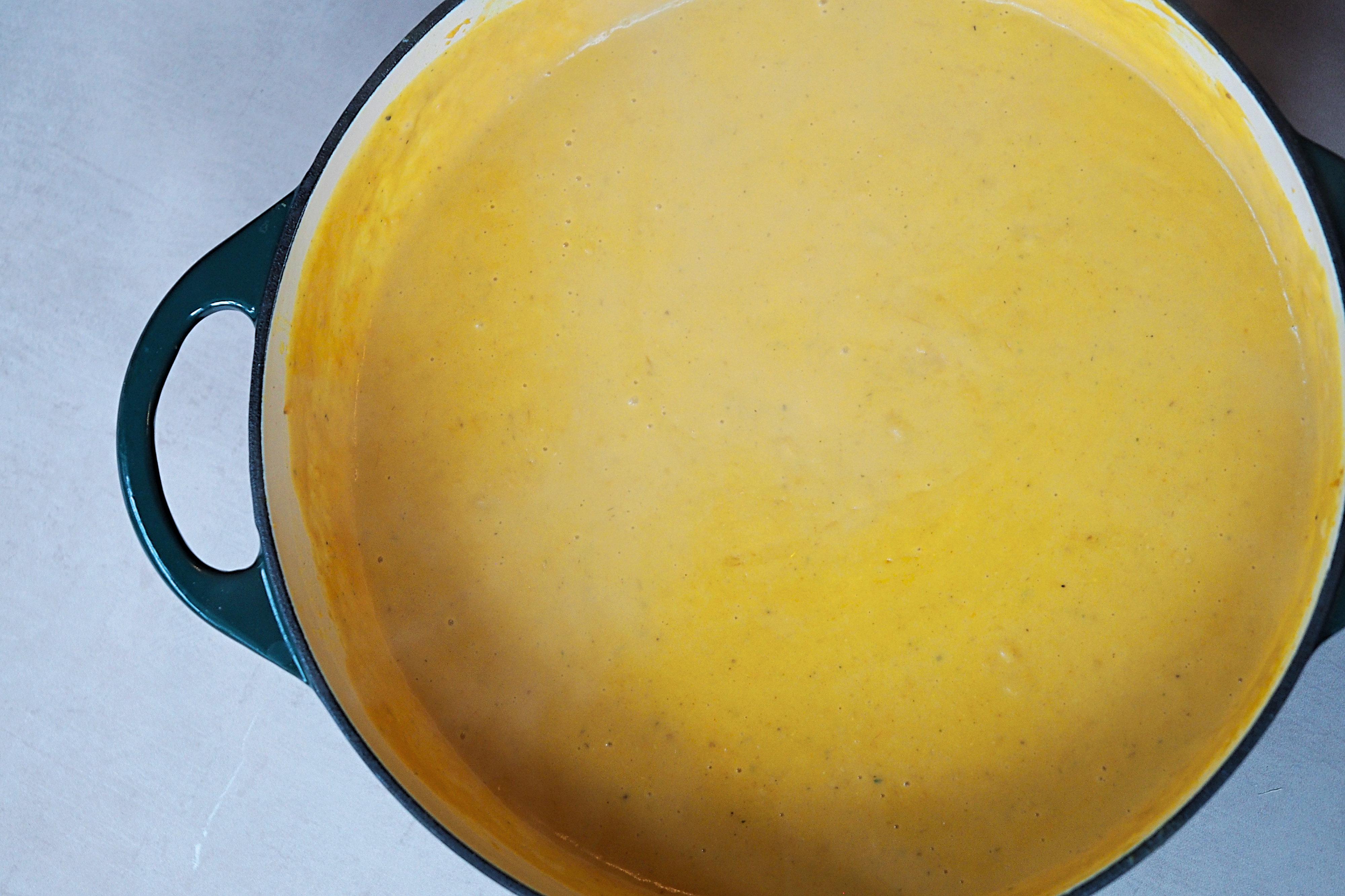 - Over a low heat, add 1/3 of coconut milk to your pan and the purée, mix or whisk together and repeat this until all the coconut milk has been added