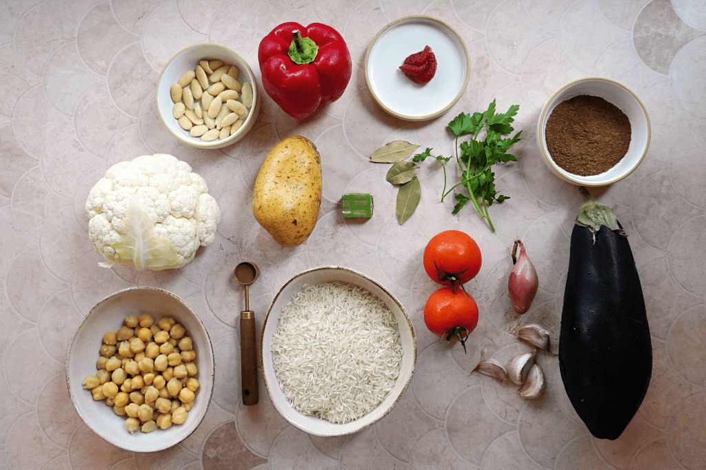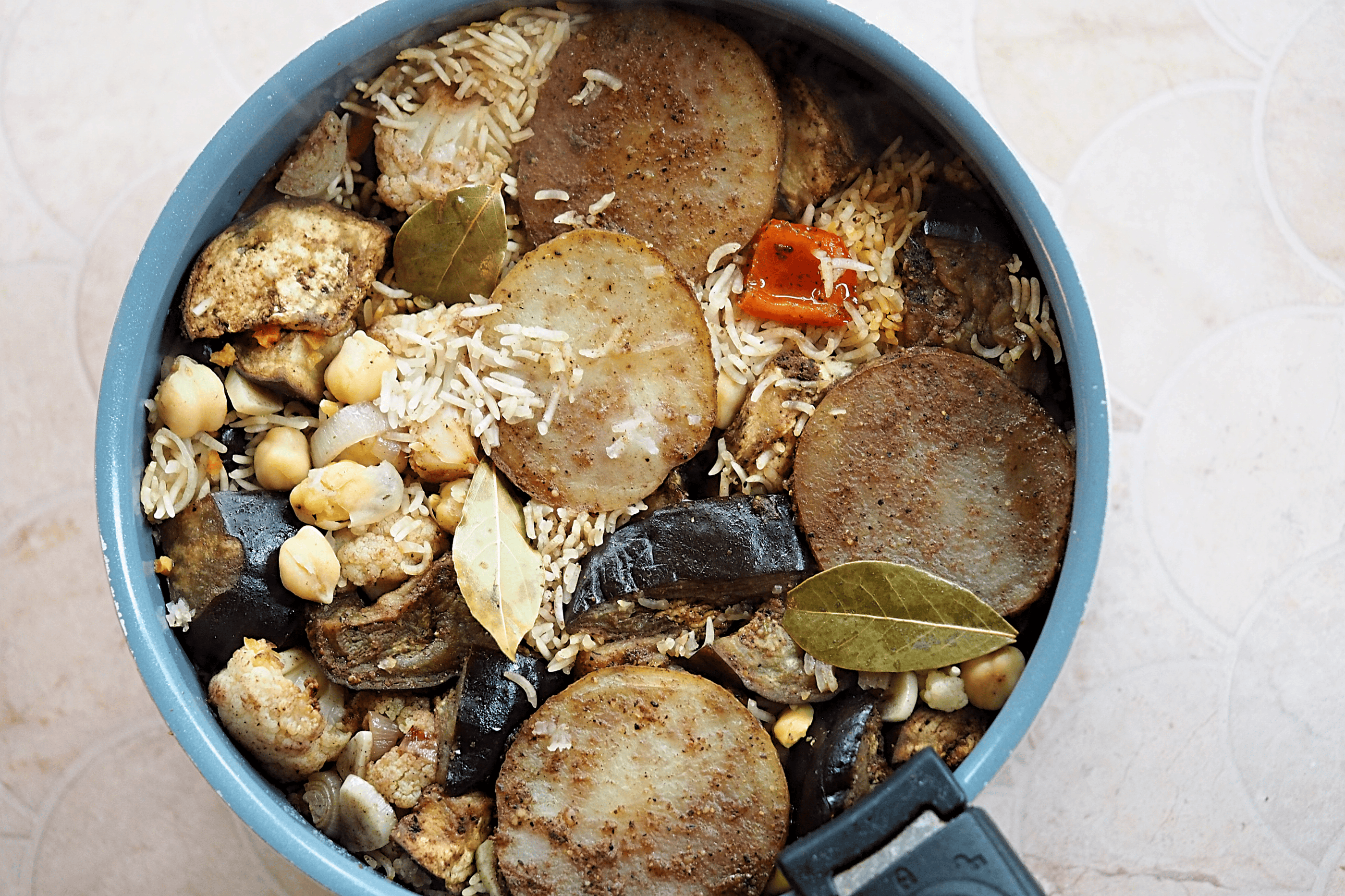 Today I’m sharing a dish I’ve tested out a good few iterations of (trying different recipes that included meat and then simply omitting it) and have tweaked to my personal preferences and to ensure maximum flavour using plant-based ingredients only. You pre-cook the vegetables within this dish then simmer it all with rice and stock until the moisture is absorbed, at which point you take your pan, put a plate on top of it and flip it to serve (hence the nickname of ‘upside-down rice’). Maqluba is a Palestinian dish and other variations can be found across the Middle East. Although we’re keeping it simple today; there are all sorts of beautiful presentations and designs that can be done with this dish. In dark times, food offers comfort and a way of fighting against cultural erasure. So, I hope I can do the dish justice and we can embody little of that idea today…