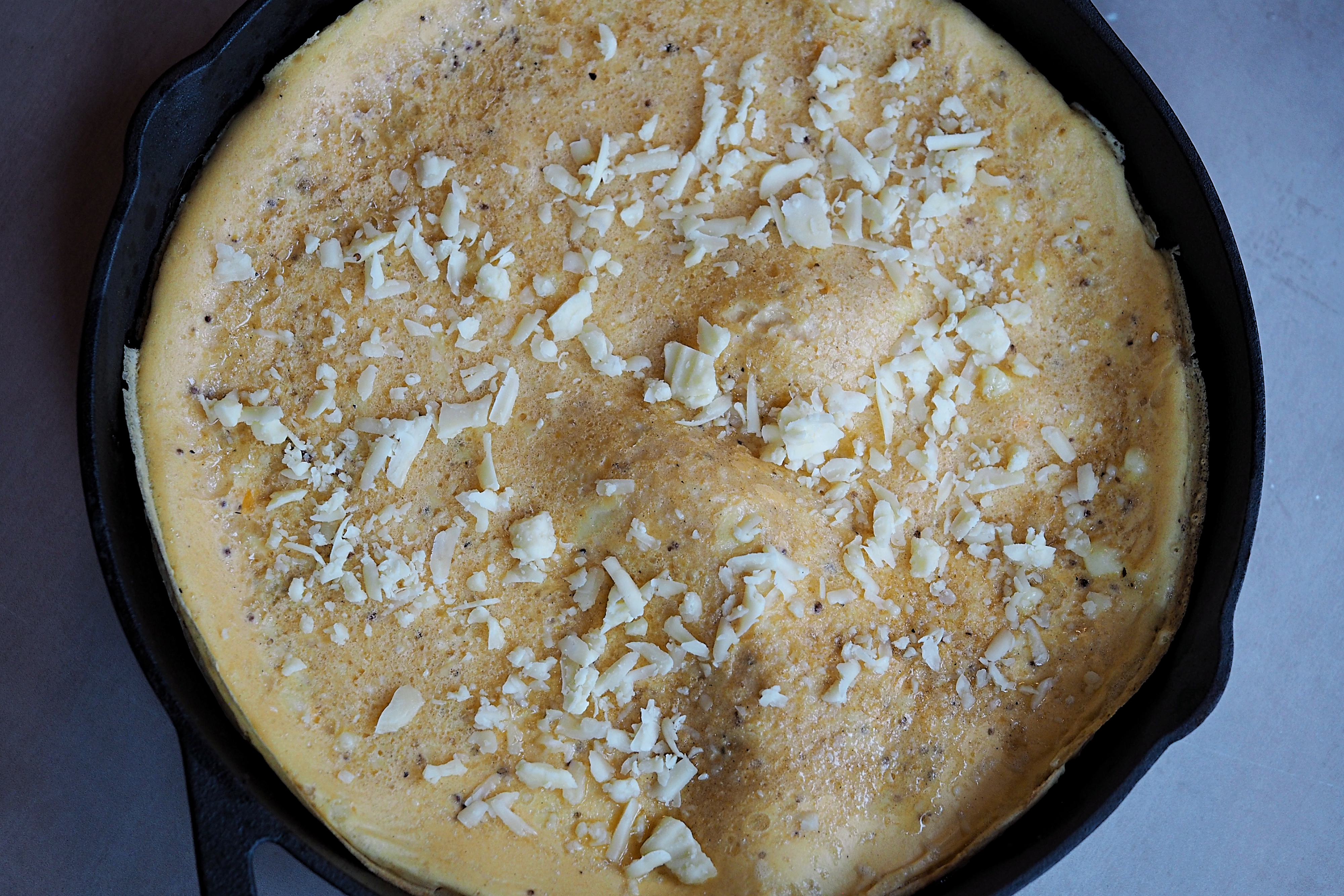 The cooking time is pretty flexible; a Dutch Baby is like an interesting cross between a pancake and a Yorkshire Pudding, so you can retain more moisture or cook it on the higher side of what I’ve suggested to get a bit of extra crisp. If you have more moist toppings, you can definitely go more towards the ‘Yorkshire Pudding’ end of the spectrum. I take it out halfway to add the cheese topping so it can melt in as pictured above.