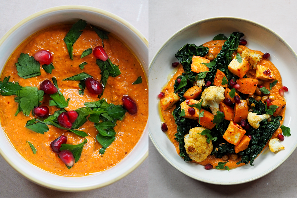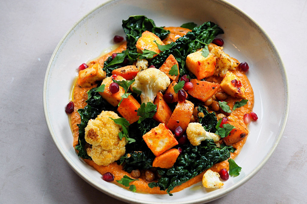 - Coat the serving plate in the Muhammara dip and serve with the chickpeas, roasted vegetables, cavolo nero and rose harissa halloumi