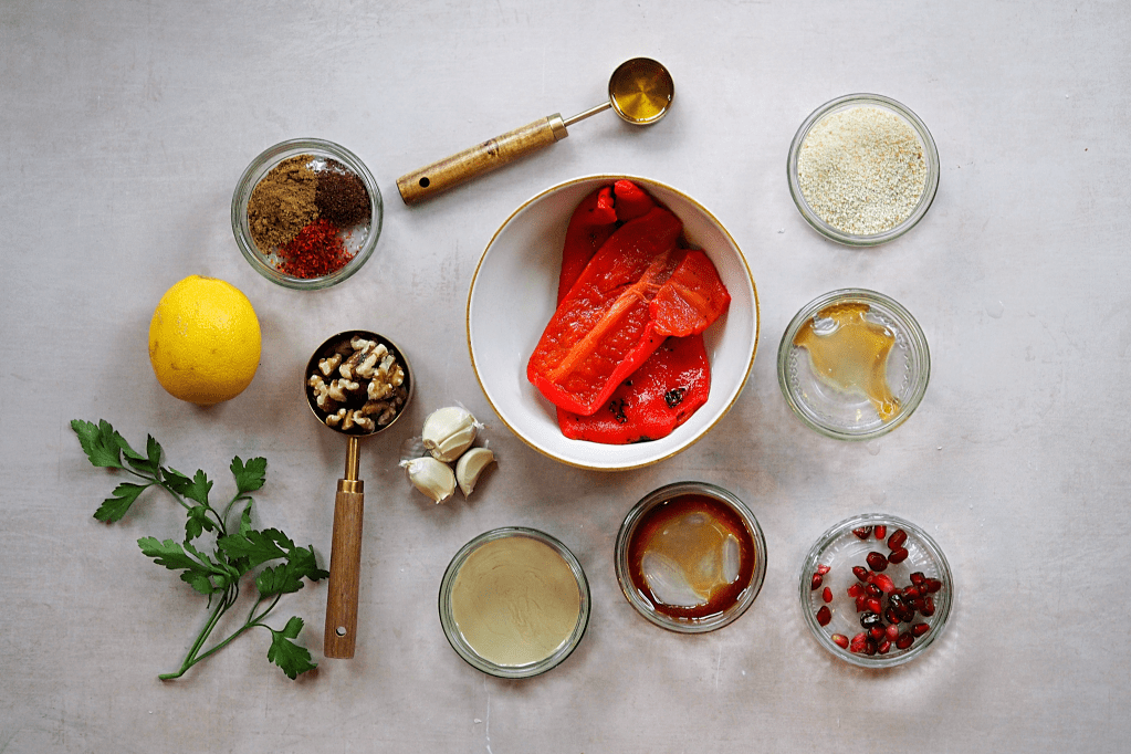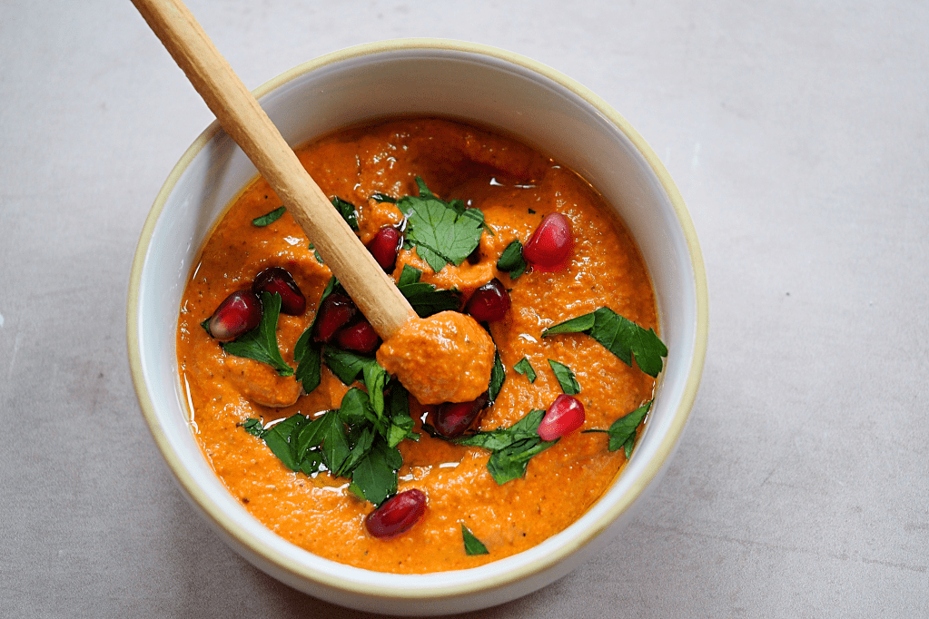 An aromatic, plant-based red pepper, walnut and pomegranate dip