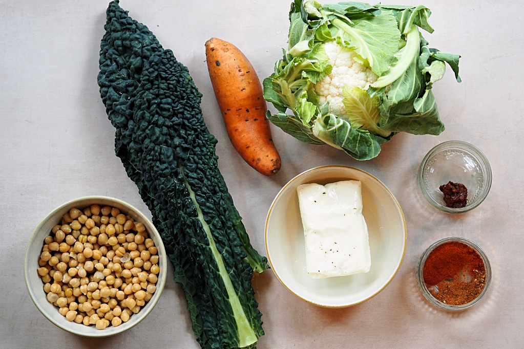 - Add the sweet potato and cauliflower to a sheet pan with a sprinkle of the ras el hanout and smoked paprika spice mix, salt and pepper and a drizzle of olive oil – oven roast for around 25 minutes