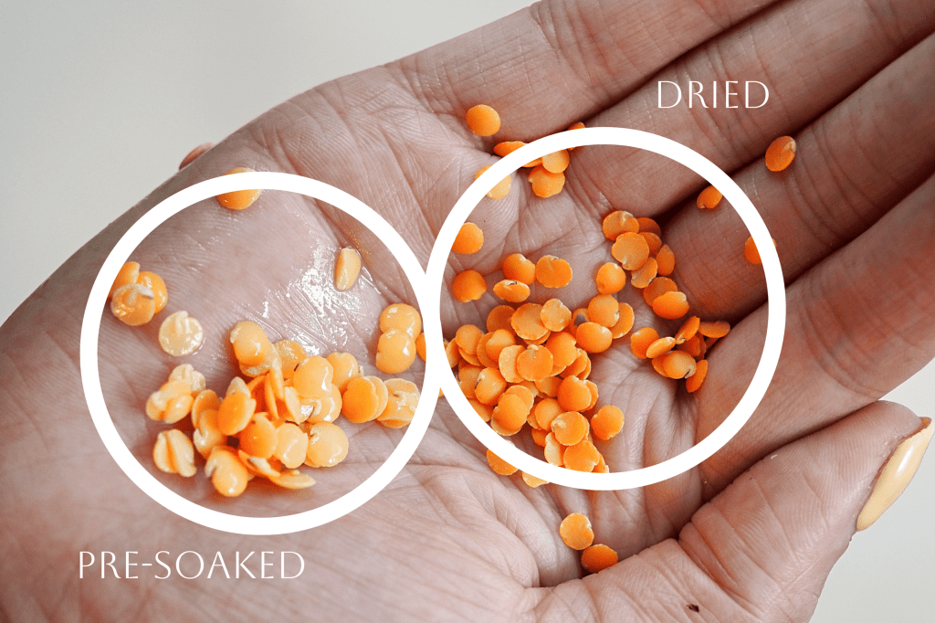 I really recommend pre-soaking the lentils before cooking. I do this because my tummy can be a little sensitive to lentils, and this makes them more digestible, and to speed up cooking time. It’s not essential; red lentils are small enough that you can absolutely just rinse them well from the packet and add them directly into the dish with a little extra vegetable stock and added cooking time (I’d allow at least another 15 minutes). However, my tip is to pre-soak them for at least 4-5 hours in cold water after rinsing the lentils well; I simply do this before work (if I’m in the office) or at lunchtime (at the weekend or if I’m working from home); it takes a couple of minutes and it does definitely improve the texture of the daal. You will notice most of the water is absorbed during this time by the lentils and they’re nicely saturated and softened when it comes to making the dal.