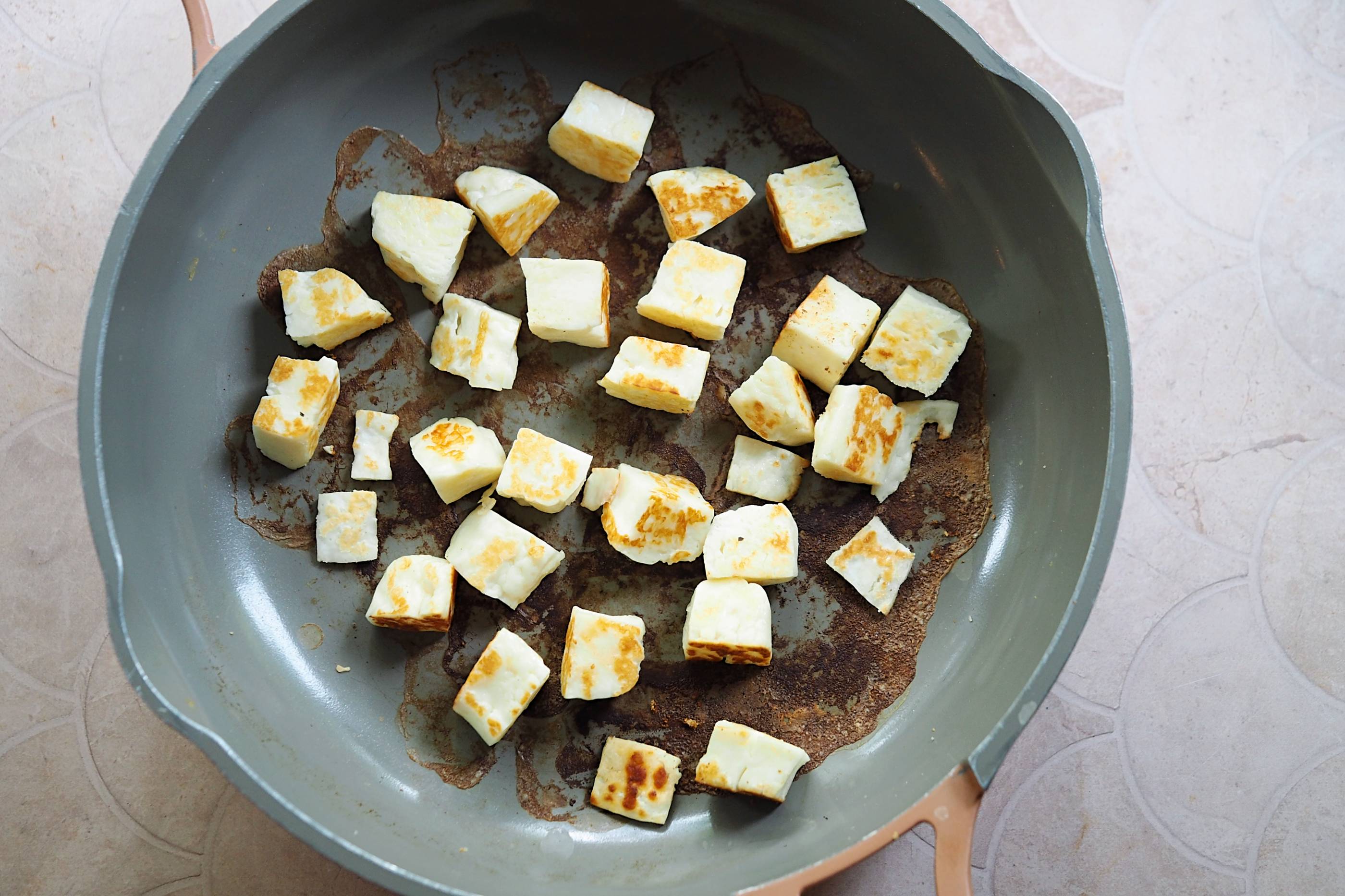 - Then increase to a medium-high heat, add the halloumi cubes and fry, turning regularly until all sides are golden (this should take around 7 minutes total)