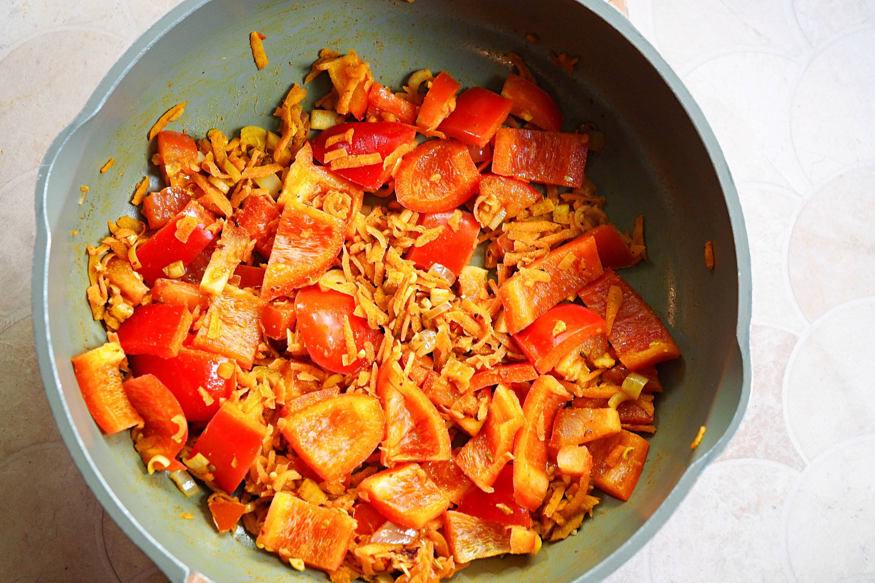 - Add the carrot and cook for 5-7 minutes until softened, then add the tomato and red pepper and cook for a further