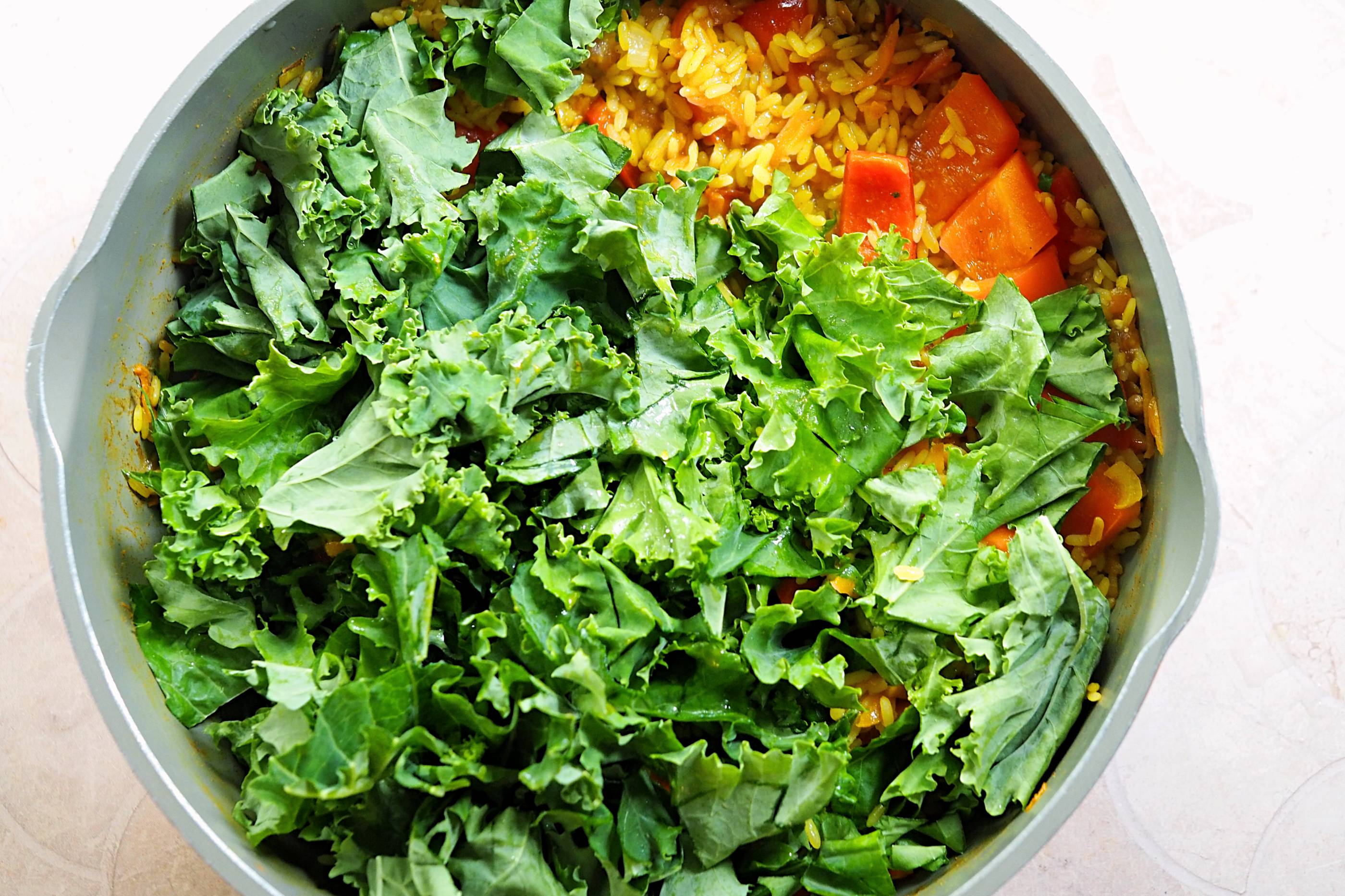 - Add the kale, stir and cover to cook for 3-5 minutes until steamed