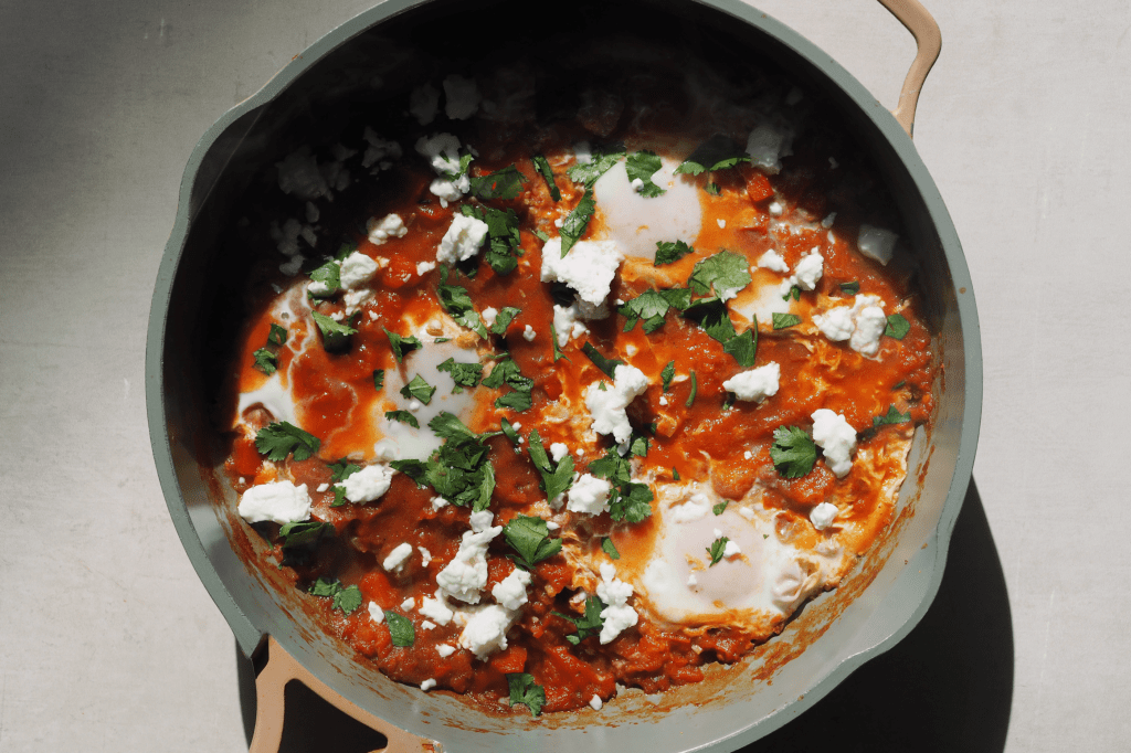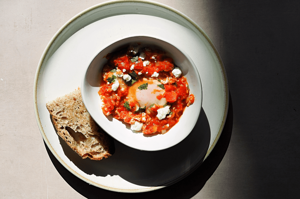 This is a really simple recipe because instead of topping off a tomato-based dish with a separately-poached egg, you’re doing a traditional ‘easy’ poach in the sauce, so all you need to do is use a wide-based pan with a lid and once the base sauce is done: create a few little divots and drop your eggs into them. Personally – so I avoid potentially getting shell into my food – I like to crack the eggs into little bowls and drop them in from there but it’s up to you, really!