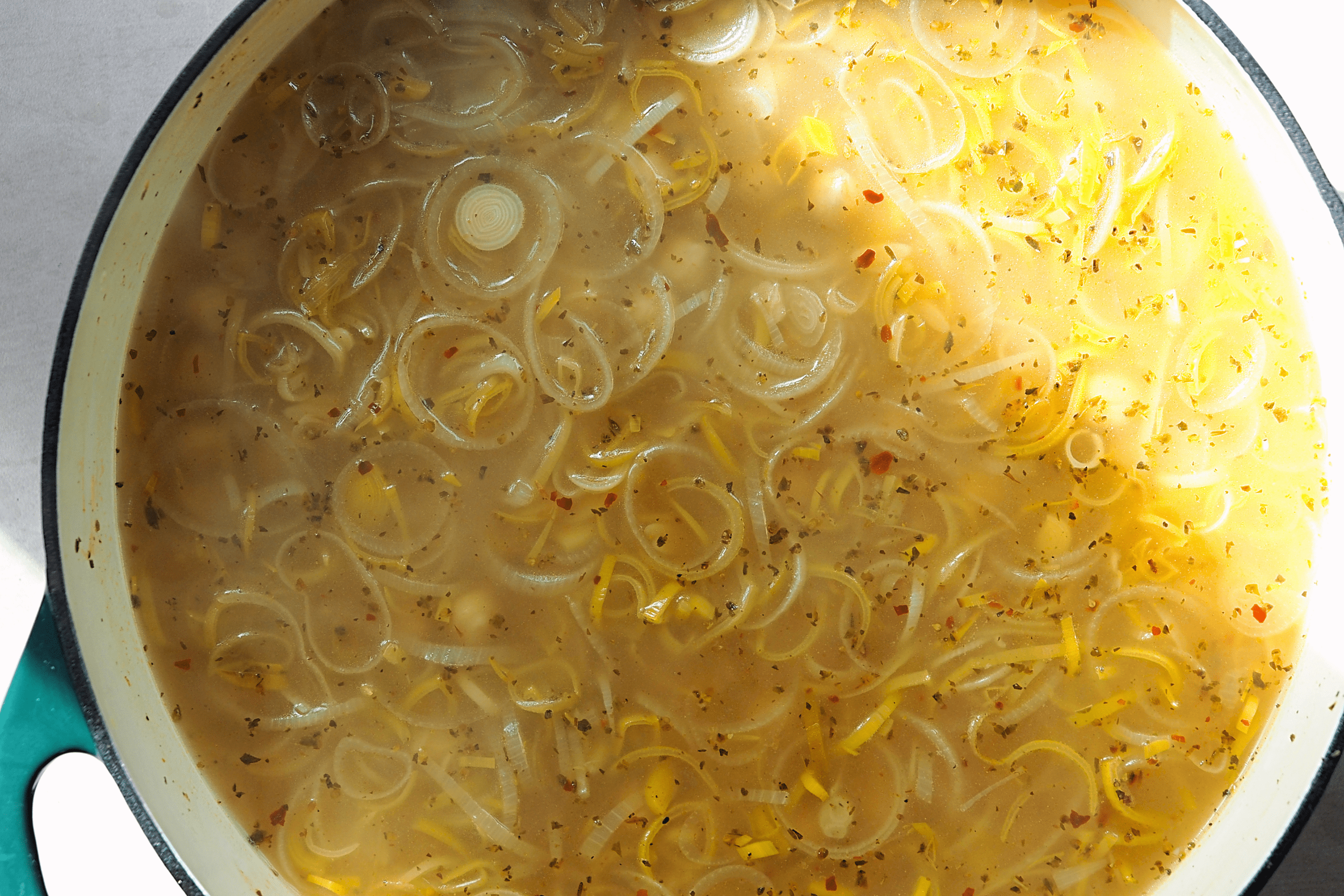 A broth-based stew with chickpeas, orzo and a fresh, zesty topping