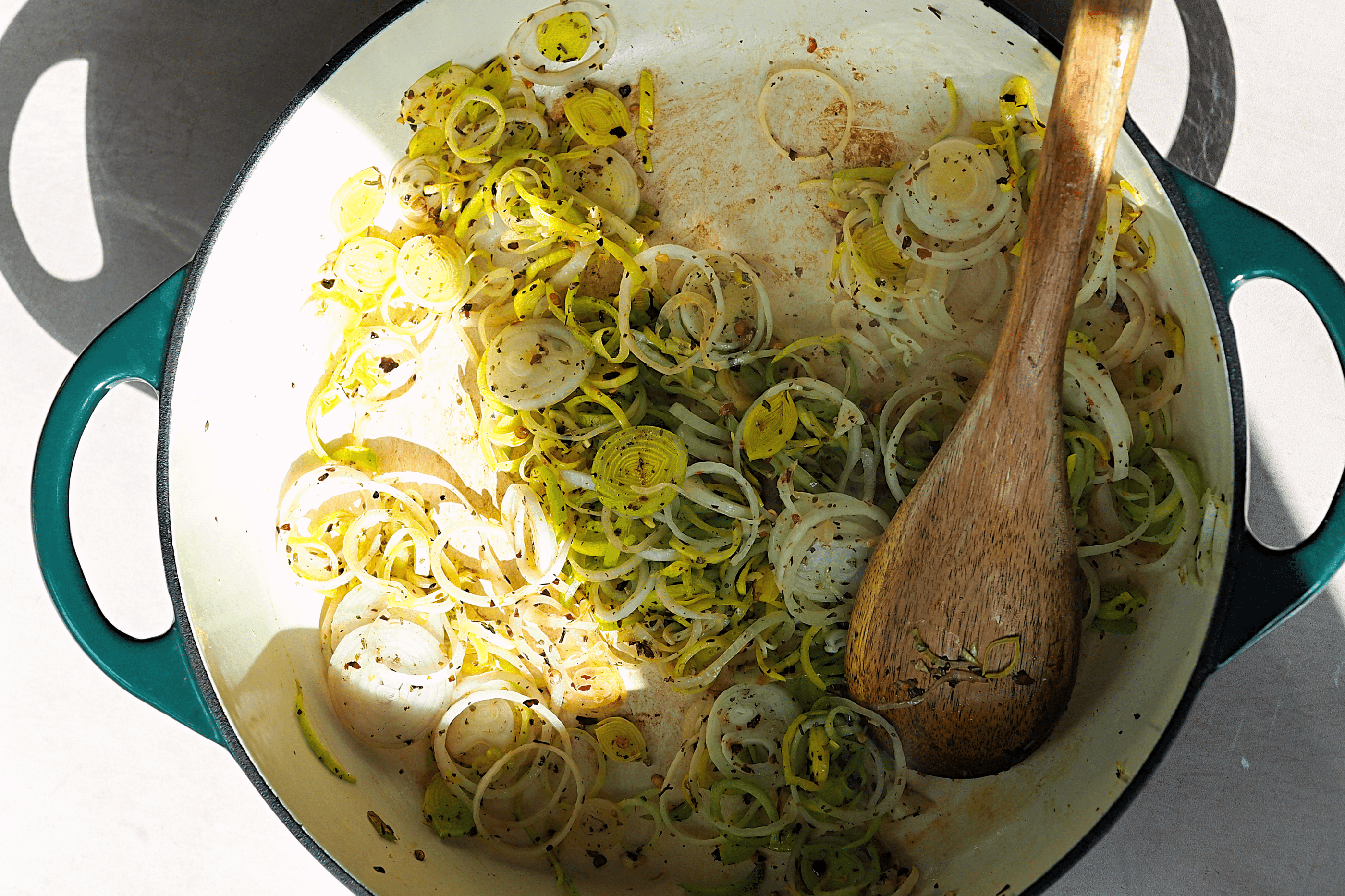 - Add the sliced leek, oregano, chilli flakes, lemon zest and season with salt and pepper and continue to sauté for 5-7 minutes until the leek has softened