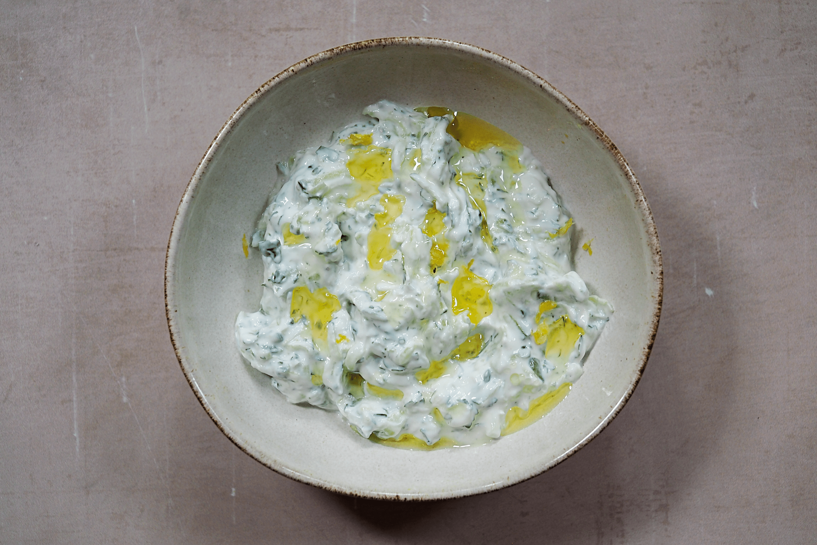 - Add the lemon juice, garlic and some seasoning to the greek yoghurt and stir together