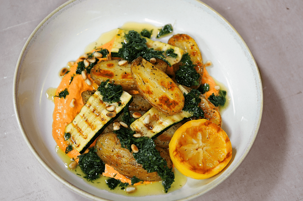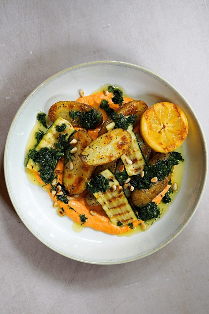 - Once the potatoes are ready, create a bed of the red pepper yoghurt on your serving plate, layer over the potatoes and courgette, drizzle over the herb dressing, sprinkle on the toasted pine nuts and serve with a wedge of charred lemon