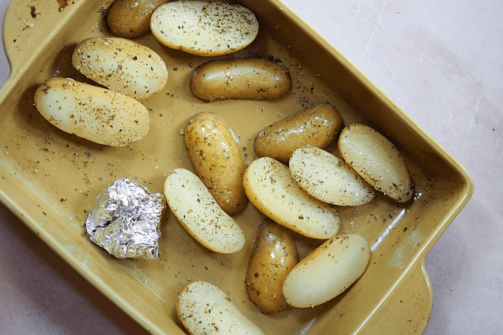 - Once the potatoes are parboiled, drain them and add them to an oven dish – season with salt and pepper, drizzle over some olive oil and sprinkle over the oregano, toss to coat them in flavour and add the foil garlic package to the dish – these can then be oven roasted for around 30-40 minutes (toss the potatoes every 10-15 minutes to cook evenly)