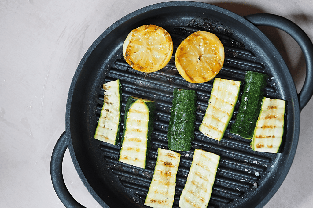 - In a wide-based frying or griddle pan, add the courgette slices and lemon halves – salt and cover to steam in their own moisture – turn halfway through cooking and add pepper and a drizzle of olive oil (optional) – this should take 5 minutes on each side to cook through (any thicker courgette slices will cook more quickly if pierced with a fork)