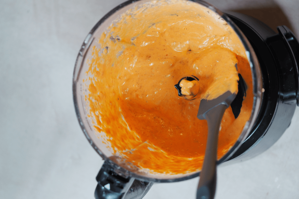 - After 20 minutes, the garlic can come out of the oven and the softened cloves can be added to the food processor with the honey, red pepper, yoghurt and some salt and pepper – blend until smooth