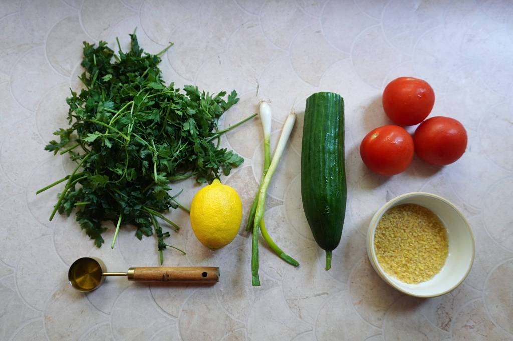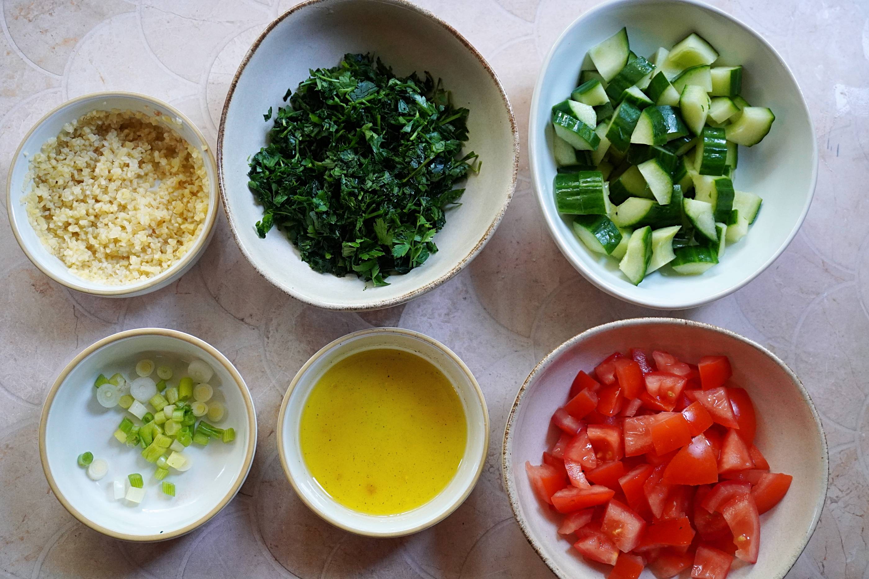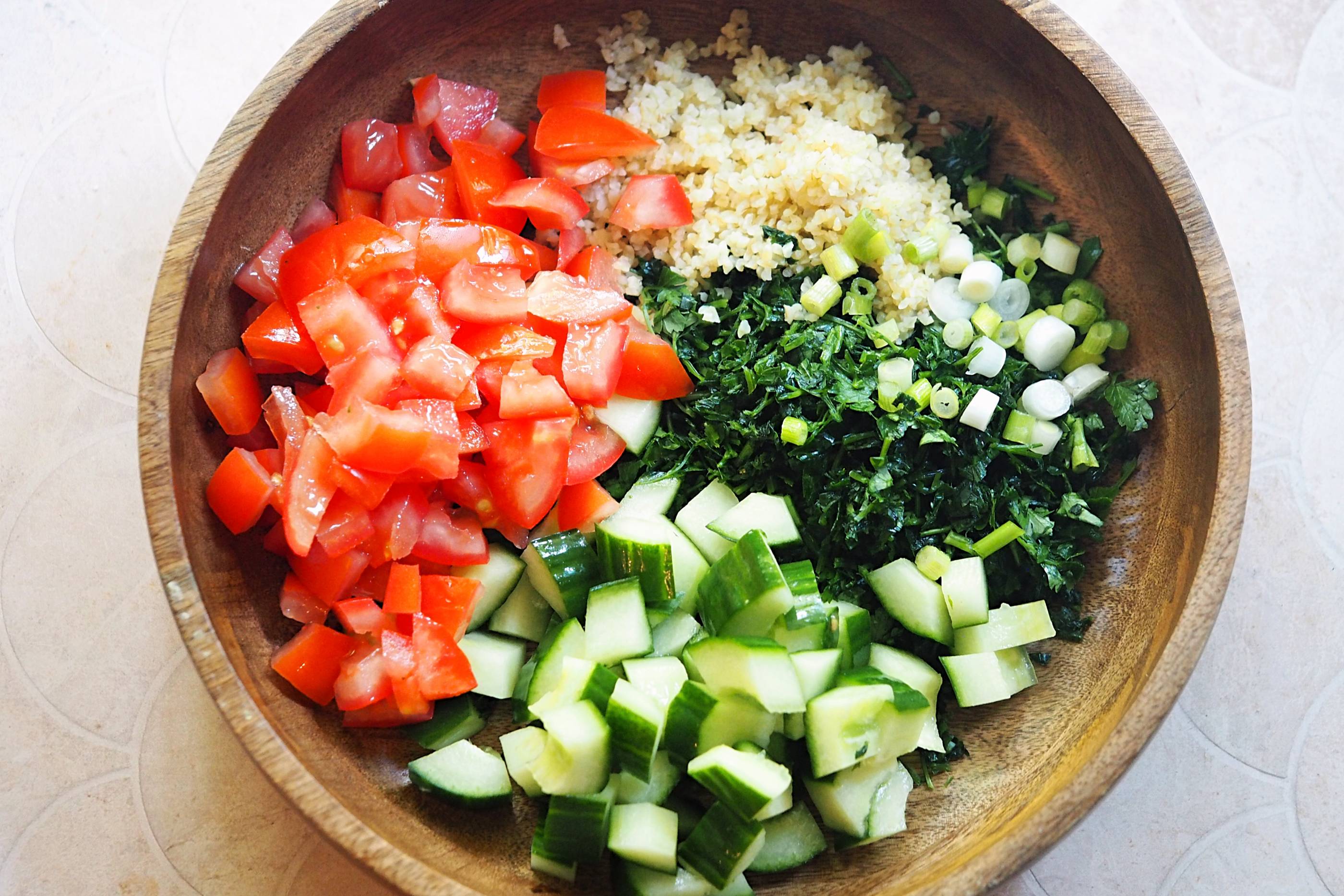 - Add the cooled bulgar wheat, tomato, cucumber, parsley and spring onion to a bowl, pour over the dressing and toss it all together to serve