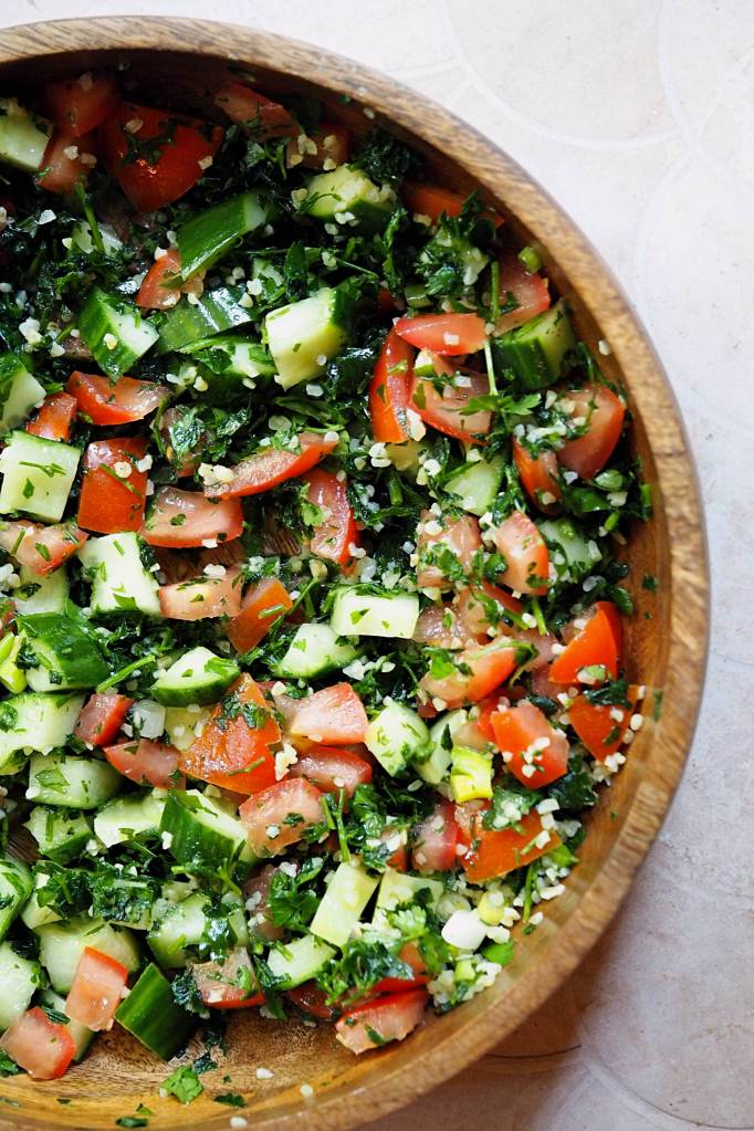 This is a simple recipe but my tips here are to let the bulgar wheat cool before combining it with everything else and to de-seed the tomatoes and cucumber to reduce the amount of water within the salad and to ensure it stays crisp and fresh.