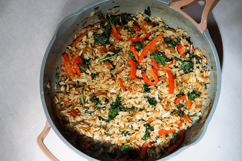 I’ve made this with day old Jasmine rice. This is because cooked and then cooled rice absorbs more flavour and is less likely to fall apart whilst being stir-fried. You can make your rice on the day but I still recommend refrigerating if you can before tossing it in with the vegetables.