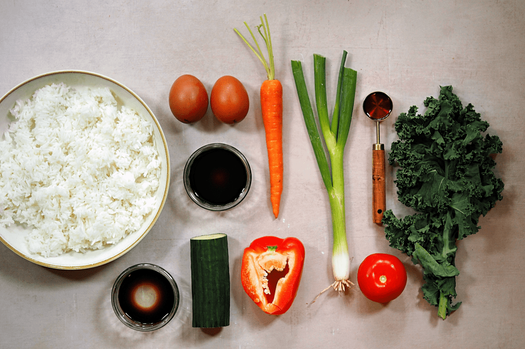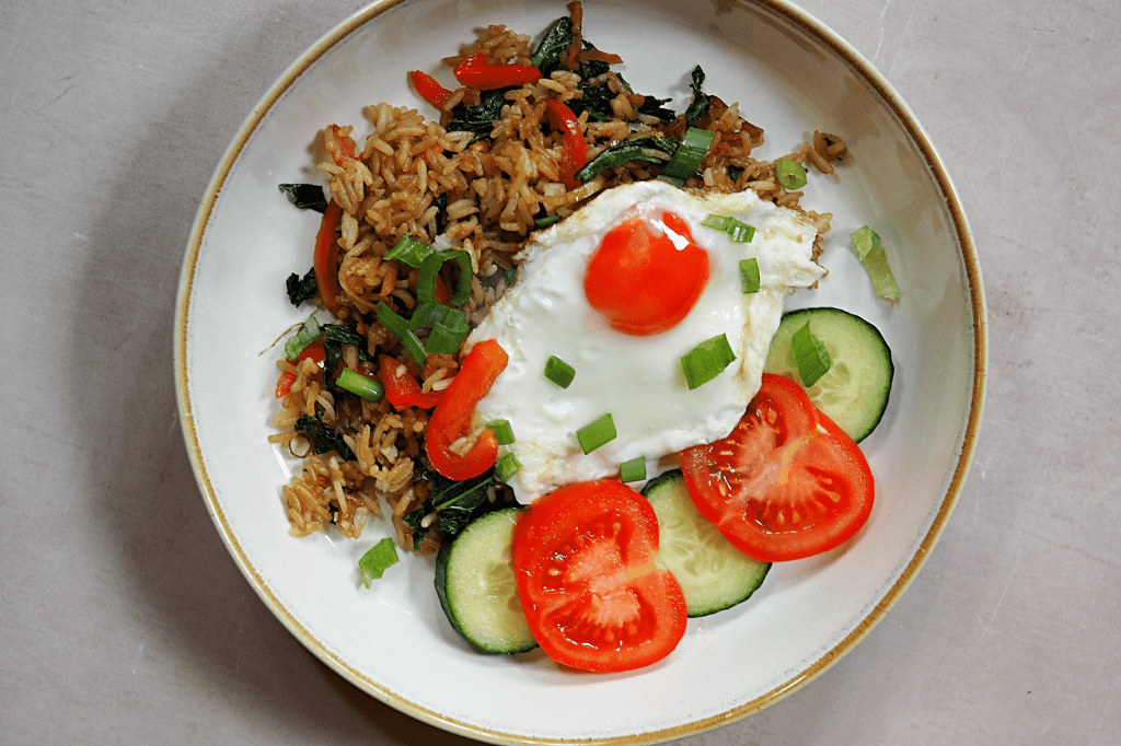 I like to keep this pretty simple; this was usually a breakfast / lunch thing for us in Indonesia, so I wanted to make this to fit into my Sunday morning or even to enjoy on a Work From Home Day (but you can absolutely add more ingredients like garlic, shallots, fresh chillies and meat or fish). Also, for example, typically fish sauce would be used, but I’m making this vegetarian (and bulking it out with extra veggies). You can also replace the rice with noodles to make Mie Goreng. Or, I’ve even done this as a meal prep before and swapped the fried egg for a hard boiled one to take it to work.