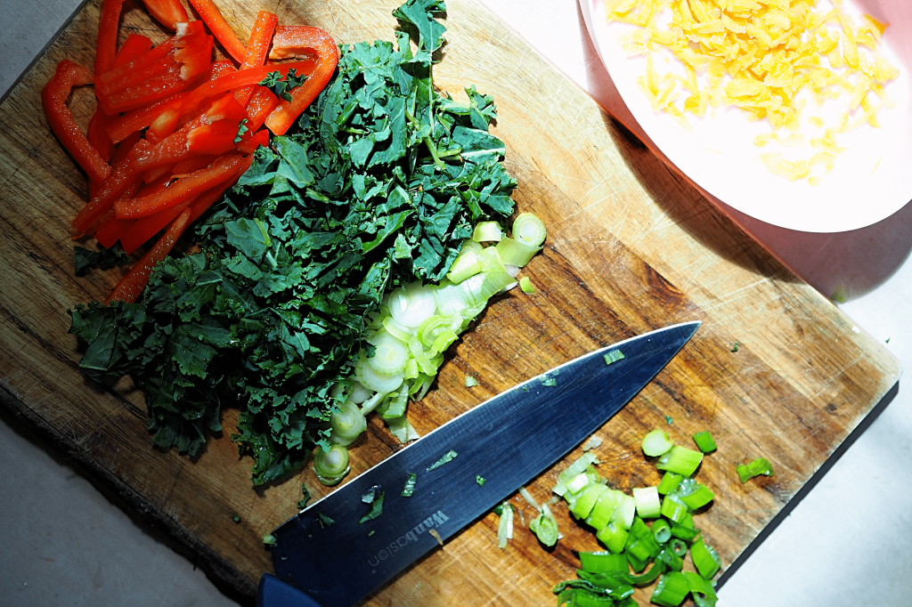 - Add the oil to a lightweight frying pan over a medium-high heat, add the white ends of the spring onion, kale, red pepper and carrot and toss together