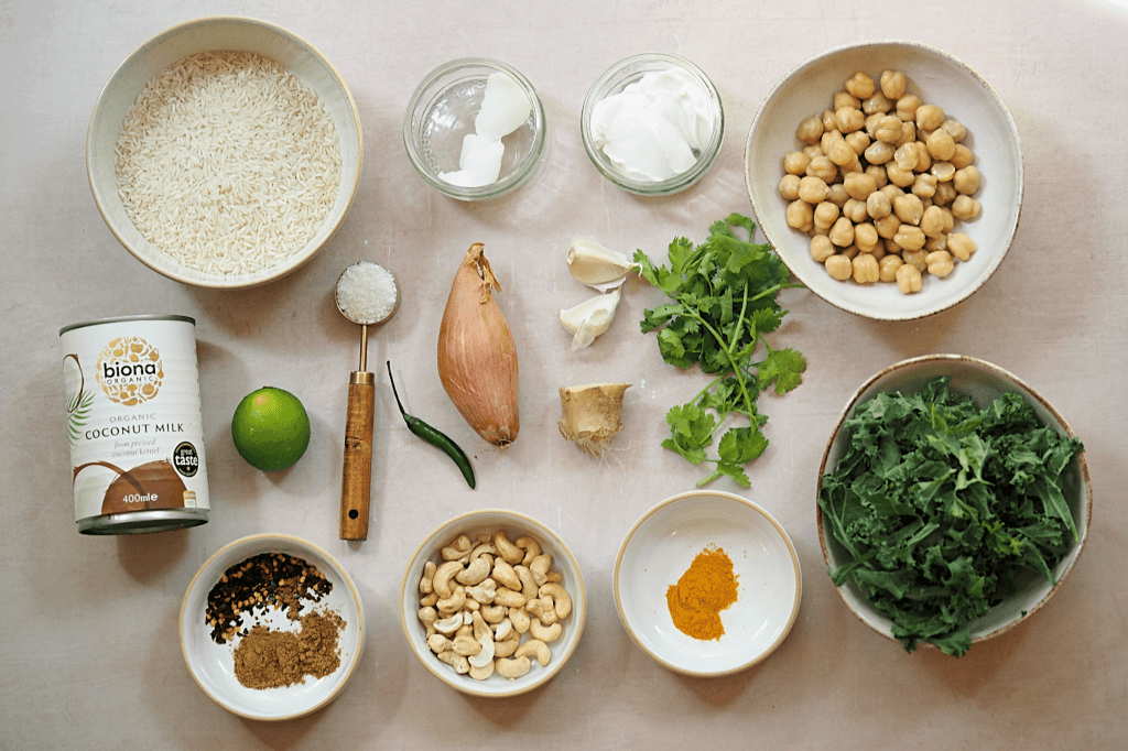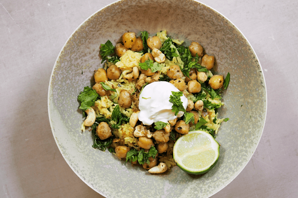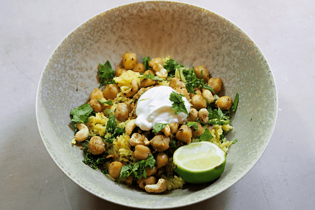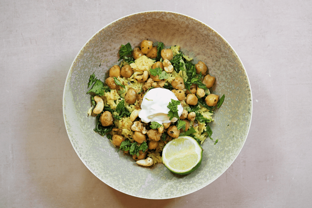 - Plate the rice with the cashew and chickpea mixture on top, finish with a dollop of yoghurt, a sprinkling of coriander and a squeeze of lemon juice (all optional)