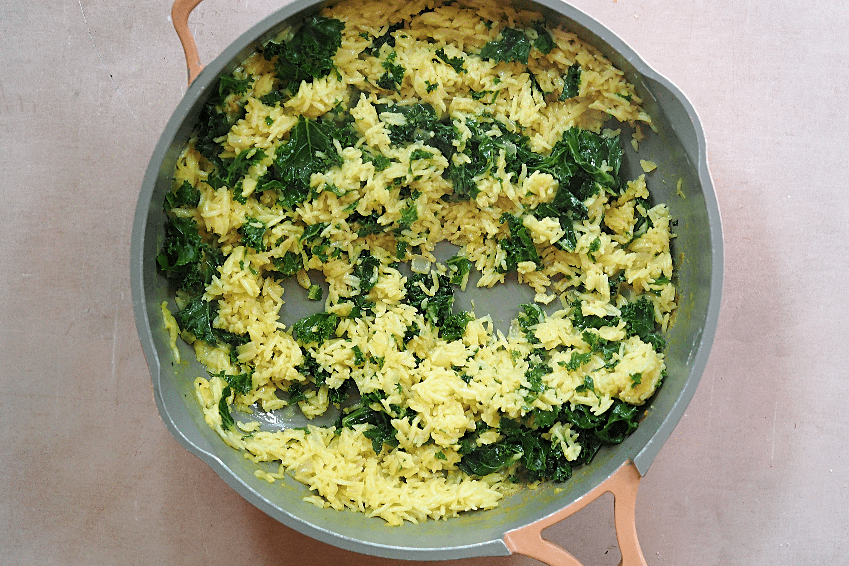 - When the rice is 90% cooked through and infused with the coconut milk, add in the kale, stir it through the rice, cover and steam for 2-3 minutes more