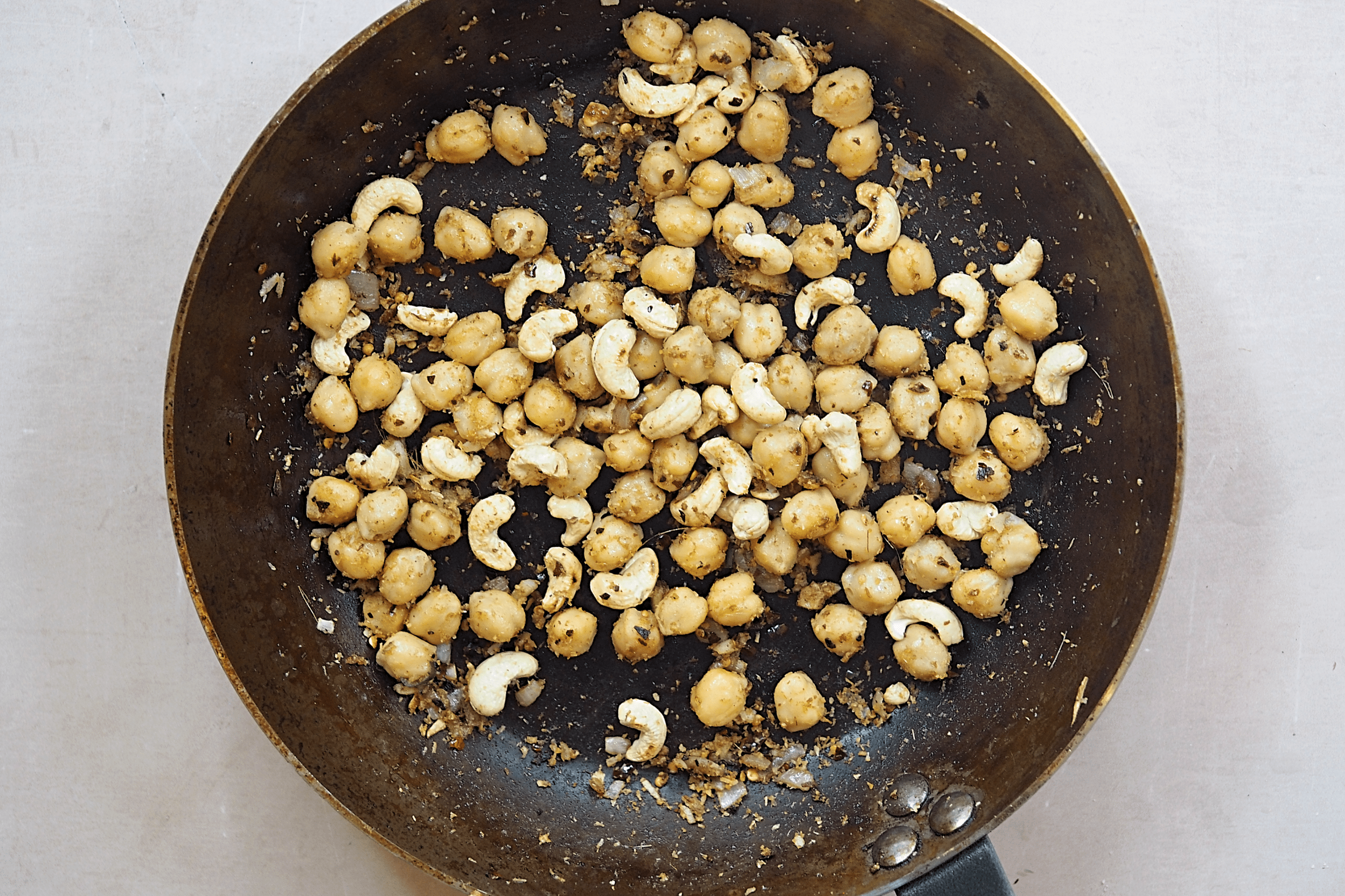 - Add the chickpeas and pan fry until they begin to brown slightly, turn them over and add the cumin, chilli flakes and dessicated coconut and continue to fry until the chickpeas are golden on both sides but nothing else has burned – combine with the cashews