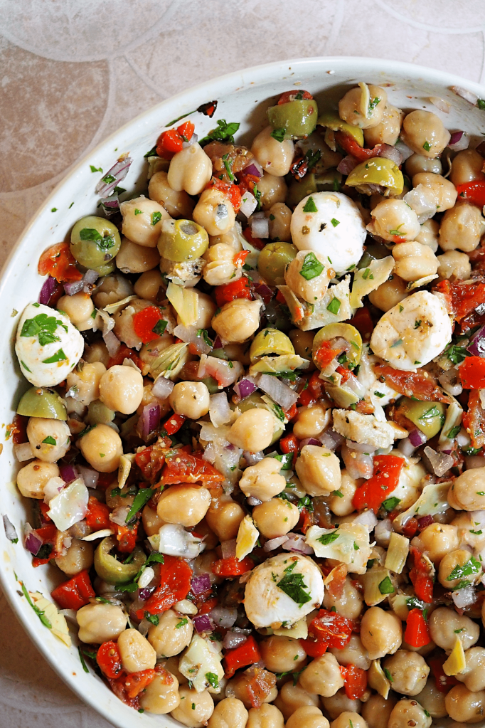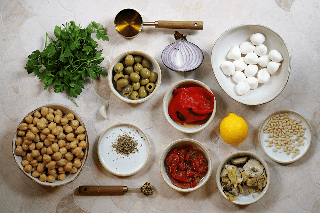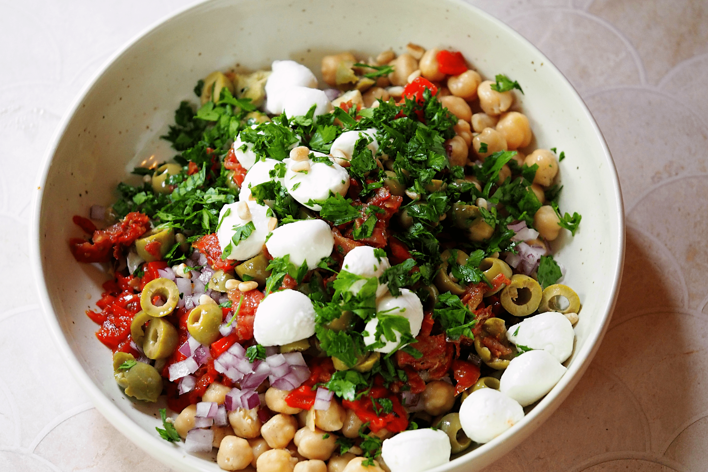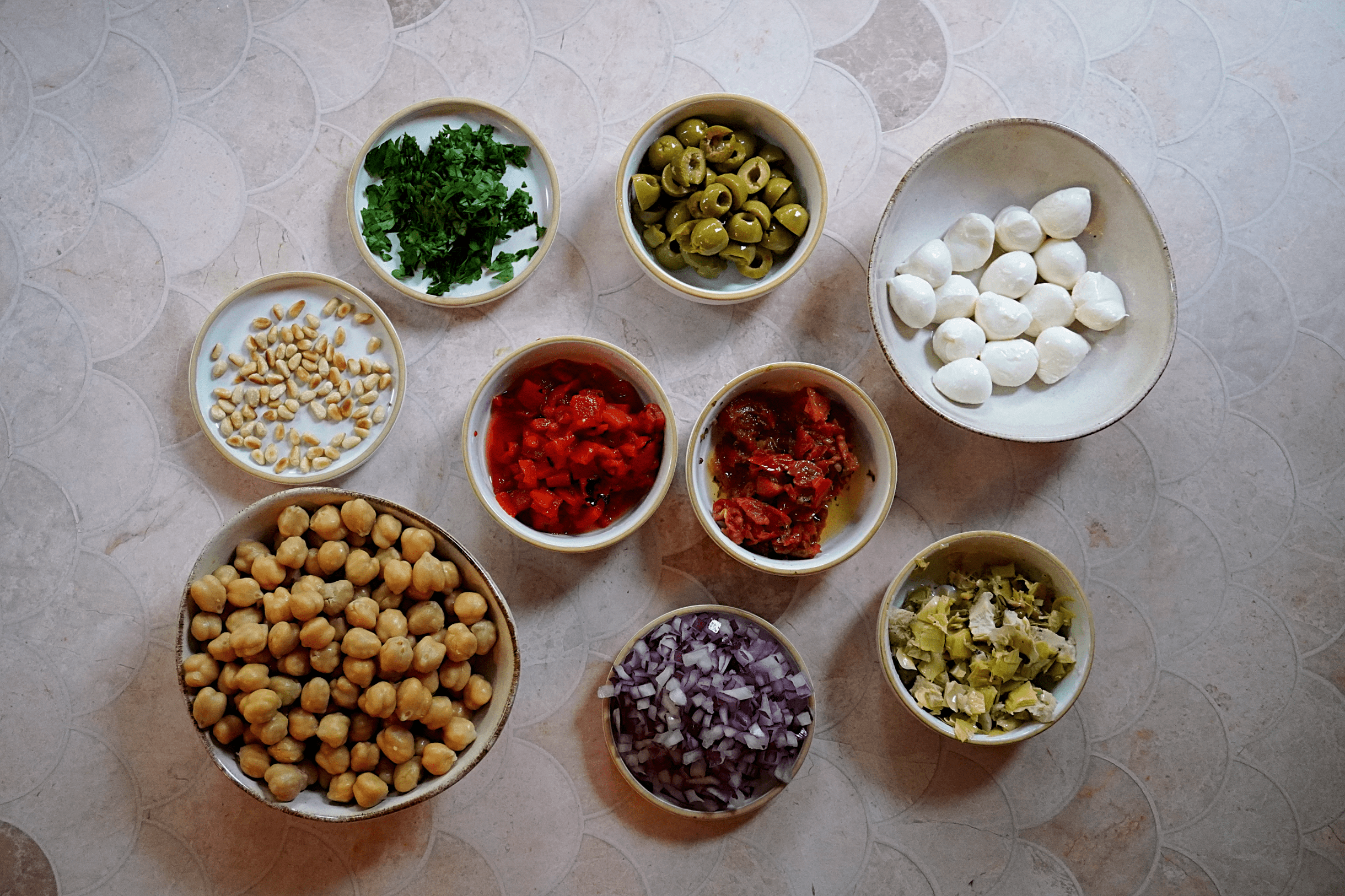 This is a really simple recipe; the only bit of ‘cooking’ involved is toasting up the pine nuts in a pan for a few minutes! It’s really all about the prep and I recommend dicing things up pretty small so you can still get a variety of elements in a single forkful. I’ve included around 1/5 of a cup of olive oil in my dressing but I recommend adjusting this depending on how dressed your ingredients are. You can even drain off any ingredients that come in an oil marinade and use that for the dressing. I used semi-dried tomatoes from a jar in oil but olives and artichokes from a deli container in the fresh section. So, just take whatever oil your ingredients are already sat into consideration!
