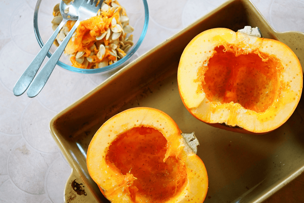 2. Carefully cut the pumpkin in half – remove the seeds from the centre with a spoon (you can wash off the orange residue, pat them dry and roast in oil in a separate oven dish alongside the pumpkin itself for your topping, if you like)