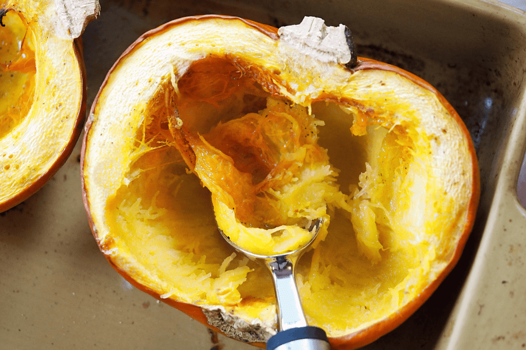 5. The pumpkin is ready to go when the flesh can easily be scooped out of the skin with a spoon (or an ice cream scoop, which is what I use!) but don’t remove all of the flesh now, let it cool for 10-15 minutes first