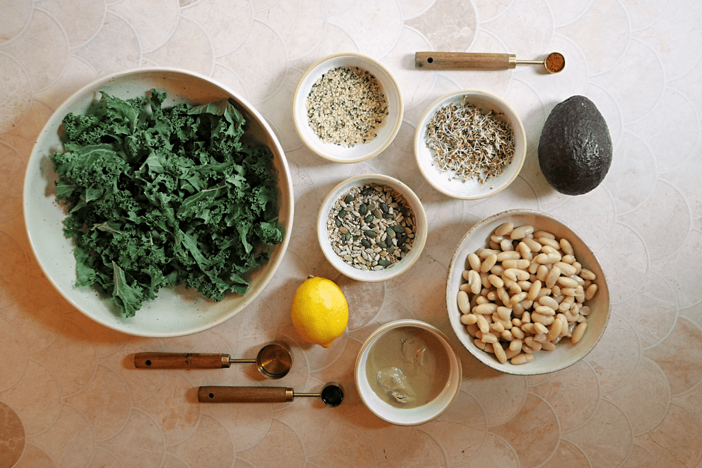 There’s something a little dystopian about people spending $21 on a pre-made salad whilst in the same city people are using food banks, but I digress! If you’ve not heard of it; Erewhon is the latest status symbol for celebrities and influencers so they can.. pay over the odds for groceries. But I have to hand it to them: their kale and bean salad looked amazing. Though I wouldn’t spend $21 on it even at a restaurant (as food simply cannot get infinitely better and more delicious the more you spend on it) and I live in the UK; I decided to make this salad myself , But additionally my version (which does have some tweaks) costs less than £5 per portion and that’s still using all organic ingredients.