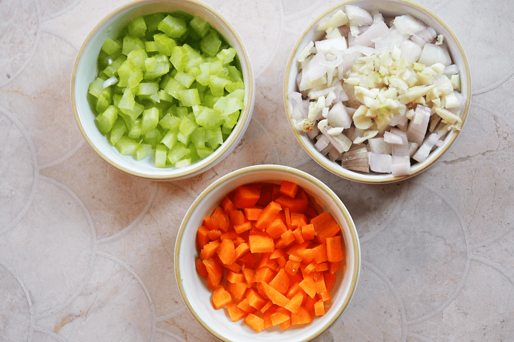 This is a simple recipe – just be sure to chop your Mirepoix nice and small and I recommend blending a little of the soup for a creamier texture, though this isn’t necessary if you don’t have access to a blender.