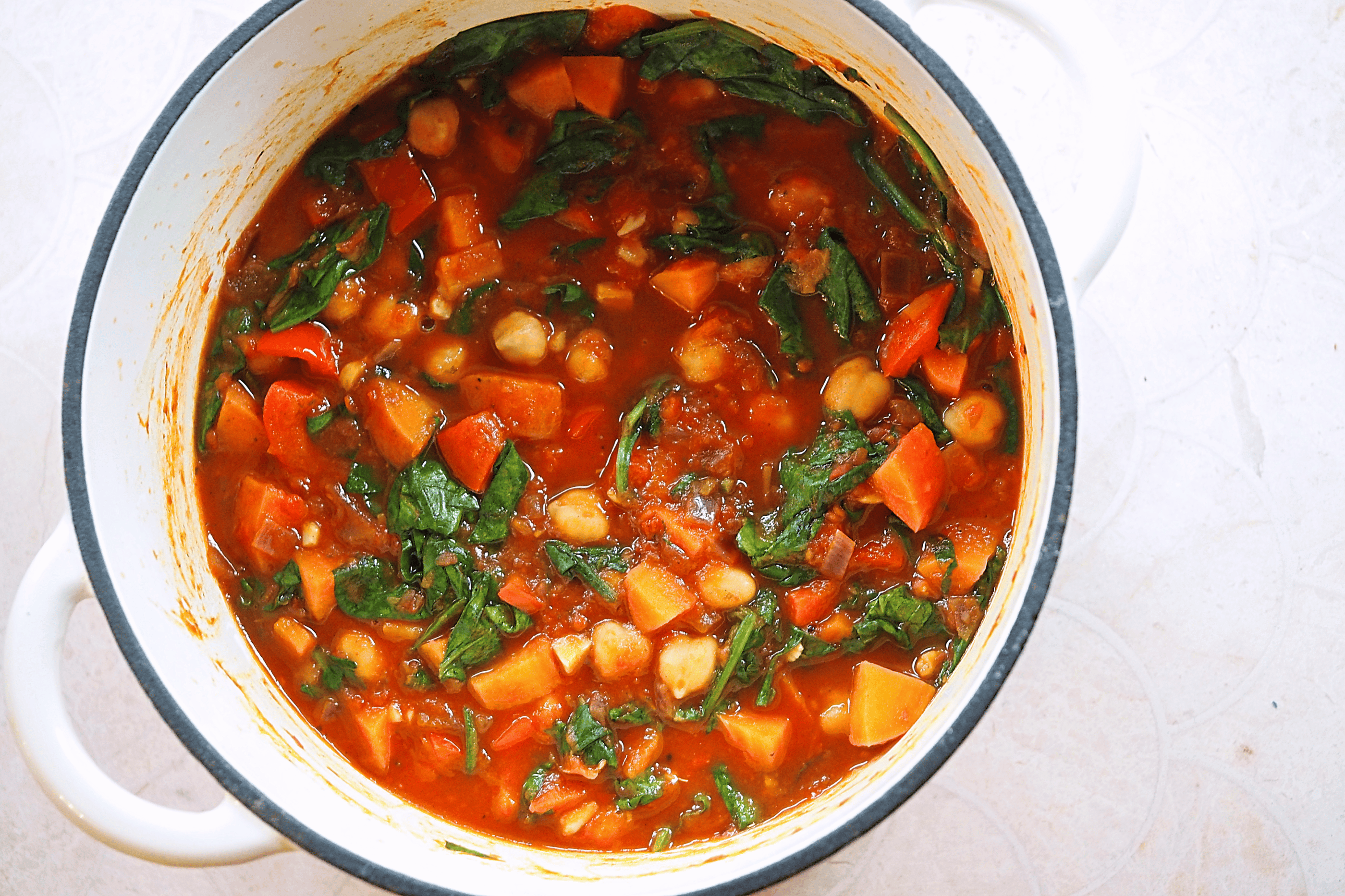 - When the sweet potato is soft and cooked through, add the chickpeas and spinach, cover and cook until the spinach has wilted (3-5 minutes)