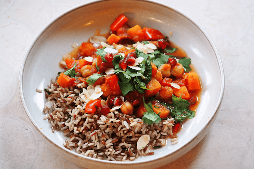 This is a great one-pot packed with flavour, vibrant colours, nutritious ingredients and plenty of fibre. I tend to make it as a bulk one pot meal prep and eat it throughout the week. I find that the toppings really elevate things and add different textures, cutting through the richness and sweetness of the stew. Personally, I found this a little chunky when I just used finely chopped tomatoes, so I blended half of the tin, but this is completely optional and I’m sure some will prefer that kind of texture. Here, I served the stew alongside wild rice but it can be eaten alone, with quinoa, couscous or with a slice of bread; it’s pretty versatile. You can even feel free to switch up the vegetables in here depending on what you prefer and what you have access to, though I recommend incorporating some natural sweetness (yellow peppers, squash, aubergine and apricot would all work well). Just make sure you cut the vegetable with the longest cook time (for me, this was the sweet potato) into the smallest chunks so it cooks at the same rate as everything else.