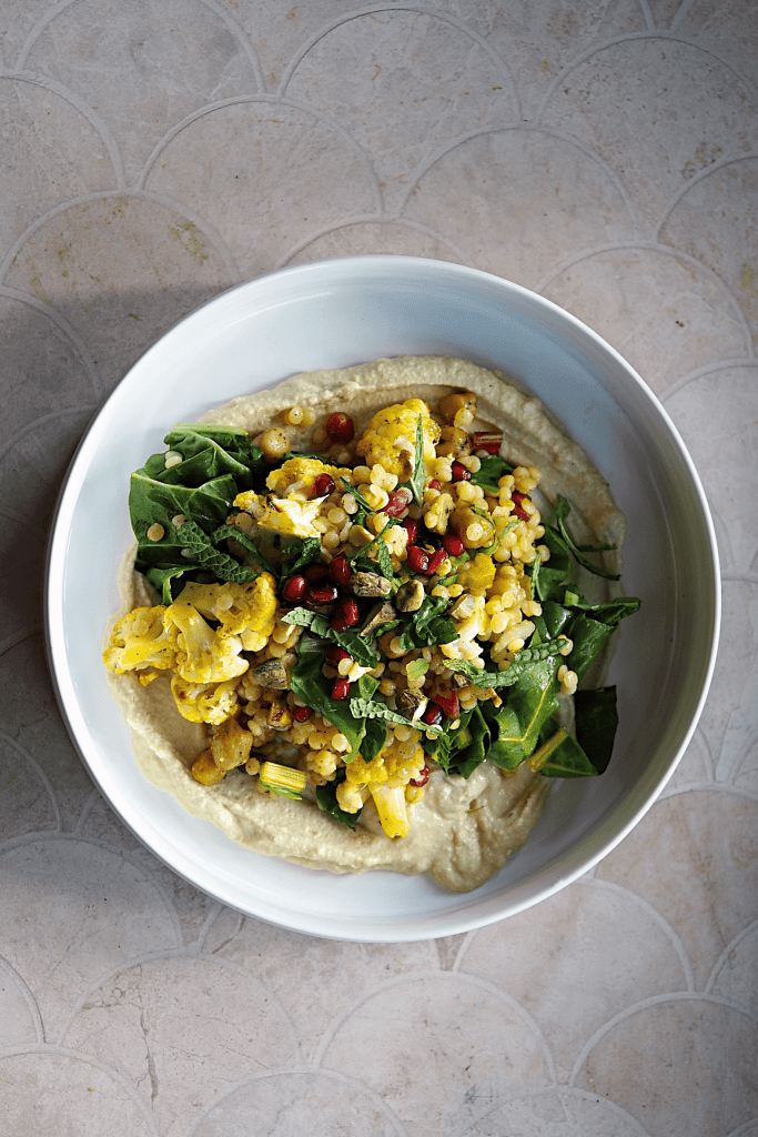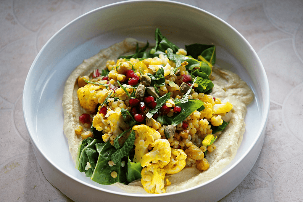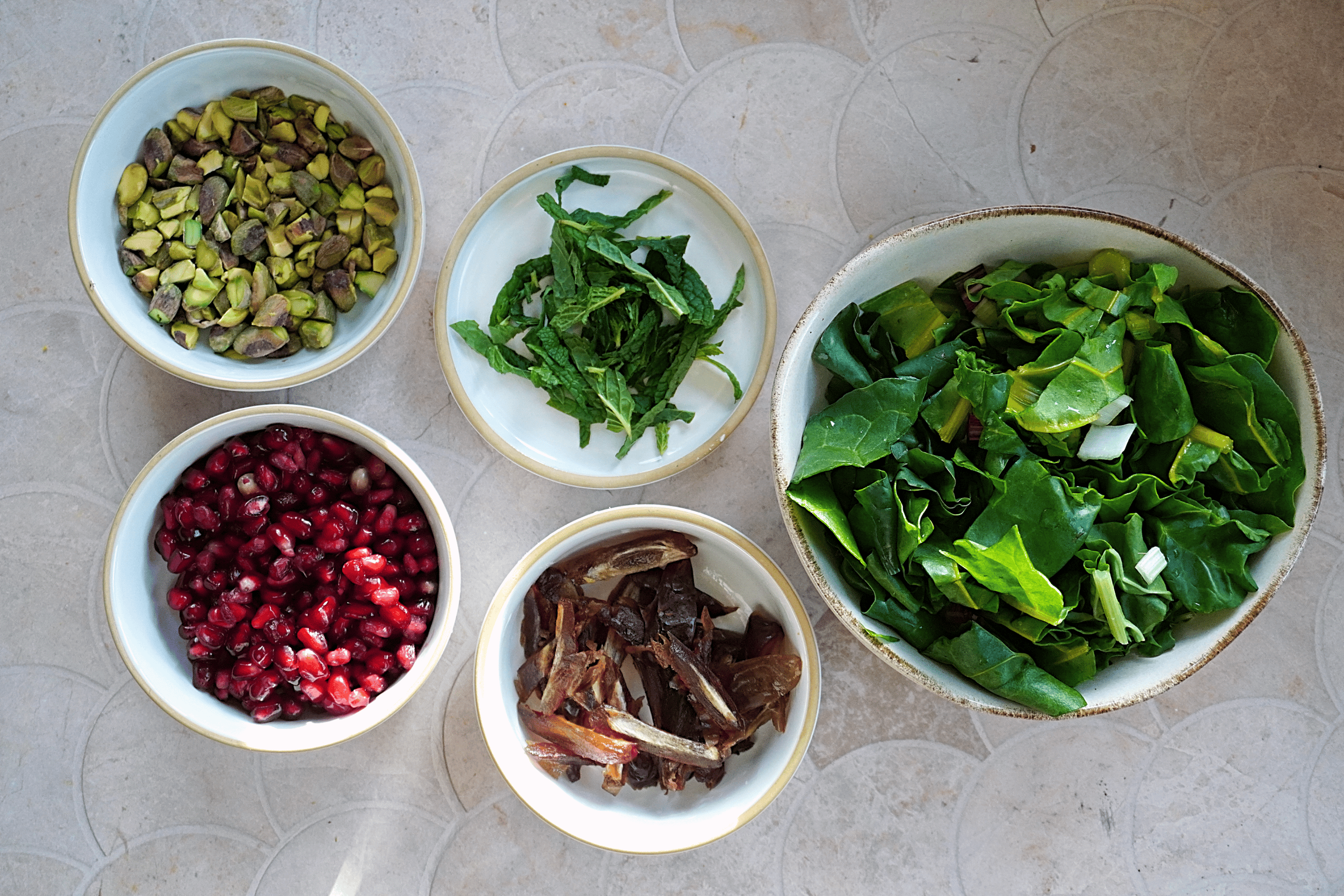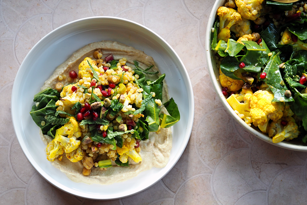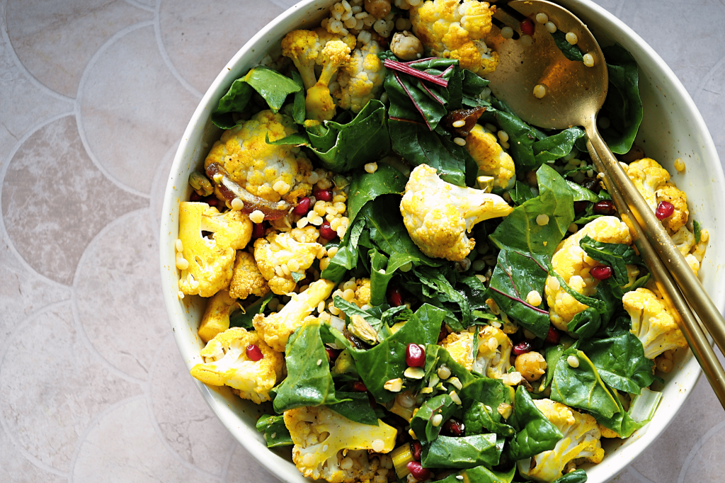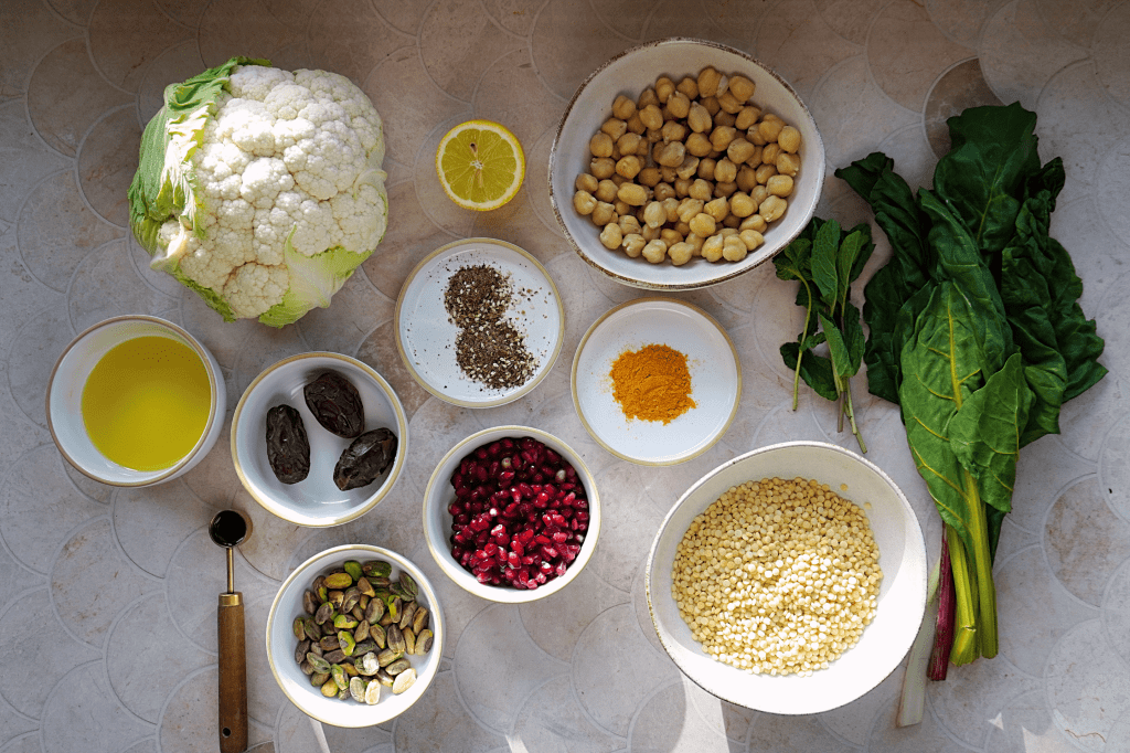 - Assemble the salad with the dates, chard, pomegranate seeds (save some for topping), cauliflower, pistachio (save some for topping), giant couscous and mint (save some for topping) then pour over the dressing and toss everything together